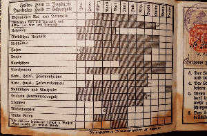 Angaben zum Formular: Druck im (noch existierenden) Verlag "W. Kohlhammer" in Stuttgart im Jahr 1946. Bei dem Werkstoff handelt es sich um Kaliko, hergestellt von der Firma Kaliko aus Göppingen. Die heutige Nachfolge-Etität ist die "Benecke-Kaliko AG" mit Hauptsitz in Hannover, ein Geschäftsbereich der ContiTech-Gruppe "Continental".