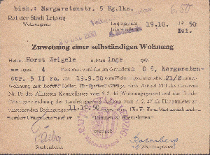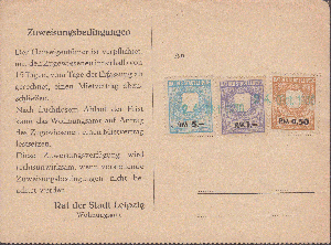 Fiskalphilatelie ist nicht ganz so mein Sammelgebiet. Aber es ist ab und zu was dabei. Hier zum Beispiel eine Wohnungszuweisung für eine 2 1/2 Zimmerwohnung. Das Wohnungsamt belegte am 24.10.1059 die Amtshandlung mit 6,50. Die Verwaltungsmarken der Stadt Leipzig sind noch in RM (Reichsmark) ausgewiesen. Seit 24.07.1948 galt die Deutsche Mark der Deutschen Notenbank als Zahlungsmittel.