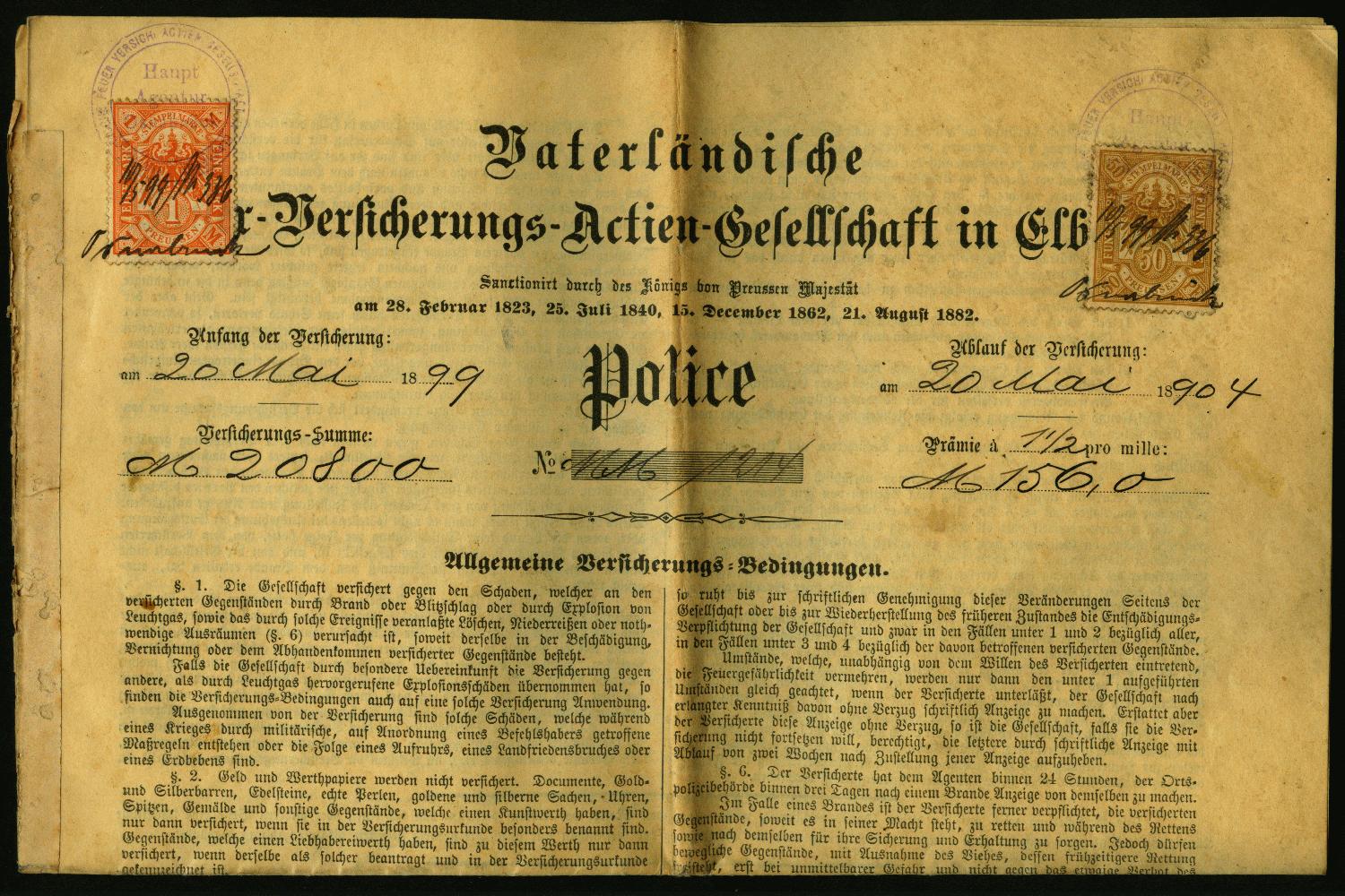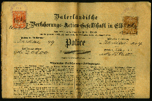 Die Versicherungspolice ist vollständig erhalten. Ich zeige nur den oberen Teil der ersten Seite.