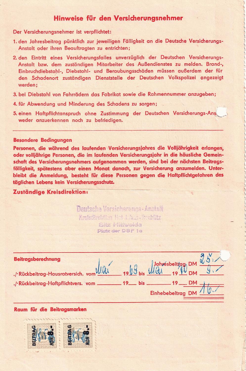 Rückseite eines Versicherungsscheins aus der DDR für eine Haushaltsversicherung von 1969 mit zwei handschriftlich entwerteten Beitragsmarken zu je 8 Mark: