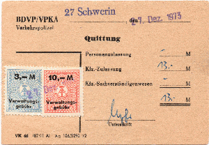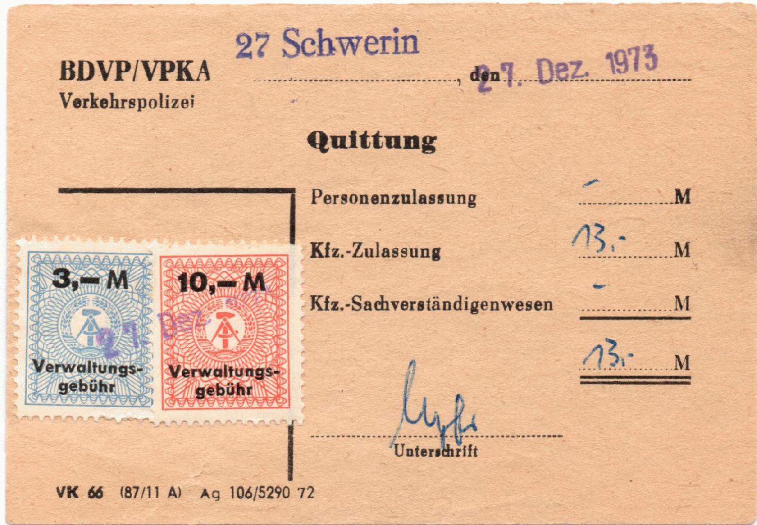 Quittung einer KFZ-Zulassung über 13,- DDR-Mark im VPKA (Volkspolizei Kreisamt) 27 Schwerin vom 27.12.1973, verklebt mit Marken über 3,- und 10,- DDR-Mark Verwaltungsgebühr.