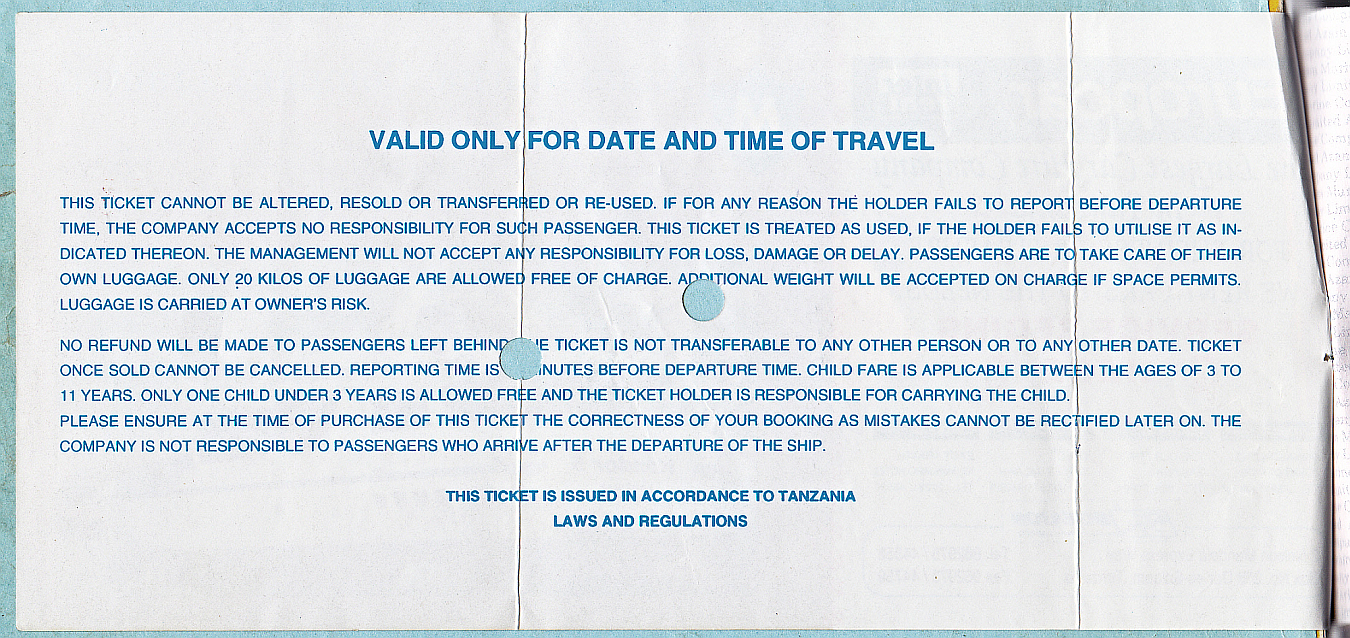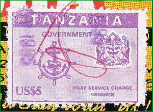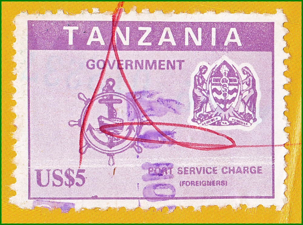 Die auf dem Ticket verklebte Steuermarke aus Tansania ("Tanzania Government") zu US$5 deckt die staatlichen Ausreise-Abfertigungsgebühren 'für die Ausreise über einen Hafen' ("Port Service Charge") für Ausländer ("Foreigners") ab.