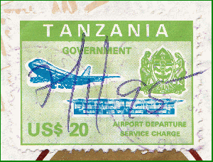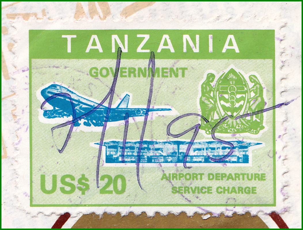 Die auf dem Ticket verklebte Steuermarke aus Tansania ("Tanzania Government") zu US$ 20 deckt die staatlichen Ausreise-Abfertigungsgebühren 'für die Ausreise über einen Flughafen' ("Airport Departure Service Charge") ab. Vermutlich handelt es sich bei dieser Gebührenstufe speziell für die Abfertigung für einen internationalen Flug?