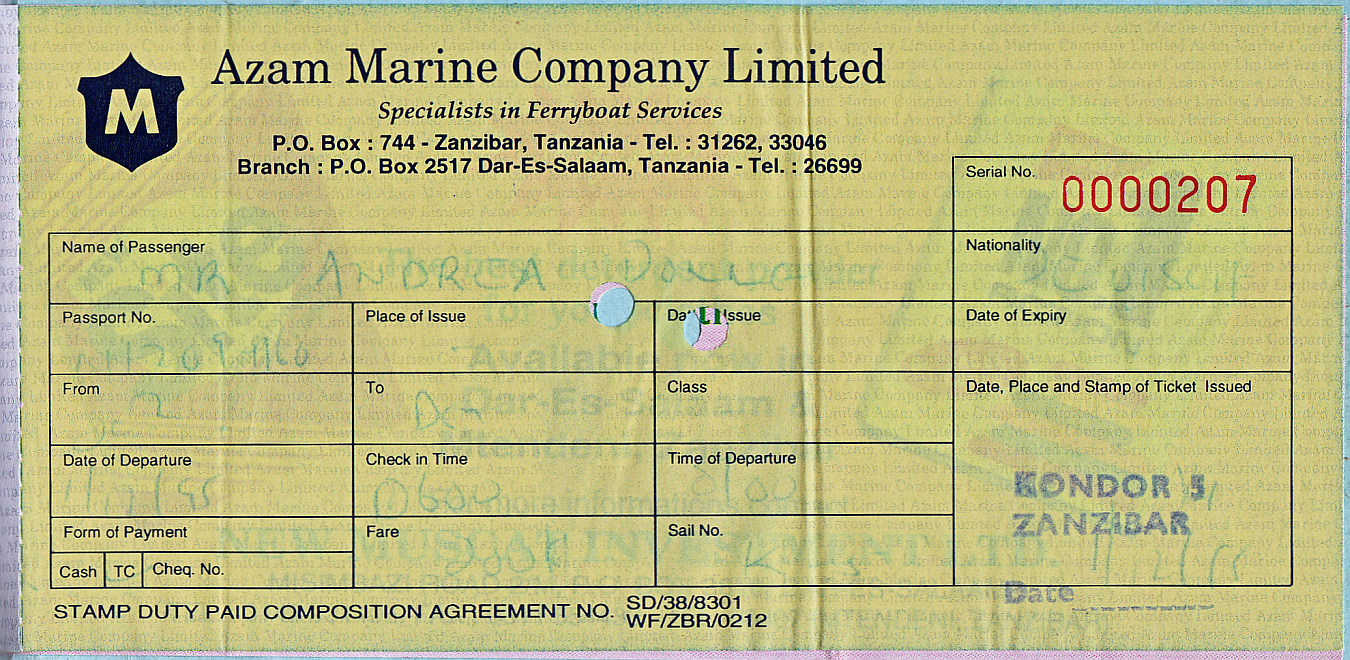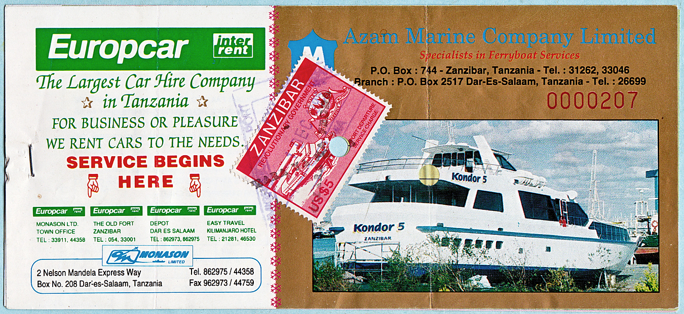 Ticket der Azam Marine Company Limited aus Sansibar [1] für die Überfahrt mit der Passagierfähre Kondor 5 [2] von Sansibar nach Dar-es-Salaam am 01.12.1995 zum Preis von 20 US$, [Vorderseite, Rückseite, Innenseite-links, Innenseite-rechts und Kundendurchschlag des eingehefteten Tickets].