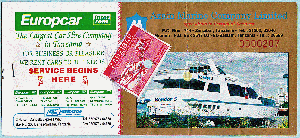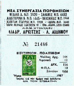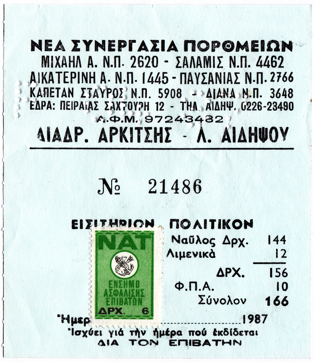 Kundenabschnitt eines mehrteiligen Fährtickets für eine Überfahrt auf eine griechische Insel, hier der ΝΕΑ ΣΥΝΕΡΓΑΣΙΑ ΠΟΡΘΜΕΙΩΝ (in etwa 'Neue Fähr-Kooperation') mit Hauptsitz in Piräus. Das Ticket trägt die Lochung Ρ 04 87. Leider kann ich die Route aber nicht mehr rekonstruieren. Der Gesamtpreis betrug insgesamt 166 Drachmen (das entsprach seinerzeit etwa knapp 2,30 DM), mit den Einzelpositionen: Fährpreis ("Ναύλος") 144 Drachmen, zusätzlich 12 Drachmen Hafengebühr ("Λιμενικά") plus Umsatzsteuer ("Φ.Π.Α.") in Höhe von 10 Drachmen. Hinzu kommt ein Pflichtbeitrag für die Sozialversicherung der griechischen Seeleute zu 6 Drachmen, die mit einer Fiskalmarke dargestellt wurde: