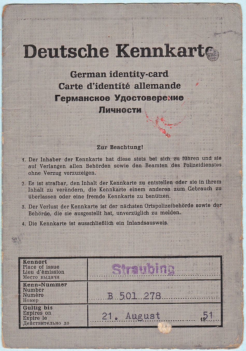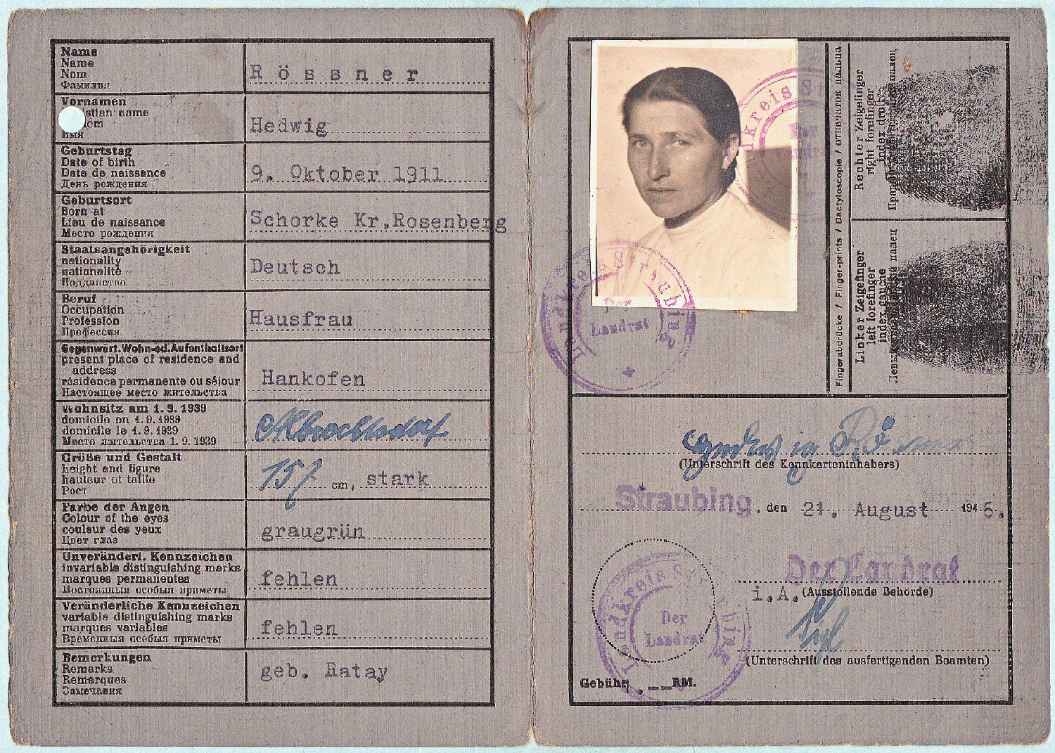 Interessanterweise wurde der Ausweis auf einen falschen Namen ausgestellt, Rössner statt Rösner, siehe auch die 'richtige' Unterschrift. Aber im August 1946 war man wahrscheinlich einfach 'froh' mit einem gültigen Ausweis seines Weges ziehen zu können und man hat deshalb wohl auch keine Welle gemacht. ;-)