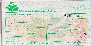 Ticket der Sea Express Service Limited [1] aus Sansibar ("Head Office") bzw. von deren Zweigstelle ("Branch") in Daressalam für die Überfahrt von Daressalam per Fähre nach Sansibar am 26.11.1995 zum Preis von 20 US$ [Vorderseite, Rückseite und Kundendurchschlag des eingehefteten Tickets].