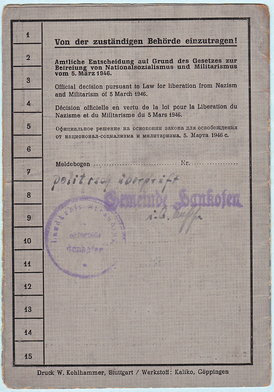 Deckblatt und Außen-Rückseite mit der 'Entnazifizierungsentscheidung' der zuständigen [Wohnorts-] Gemeinde Hankofen: politisch überprüft.