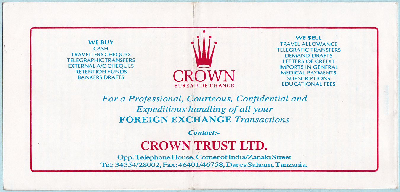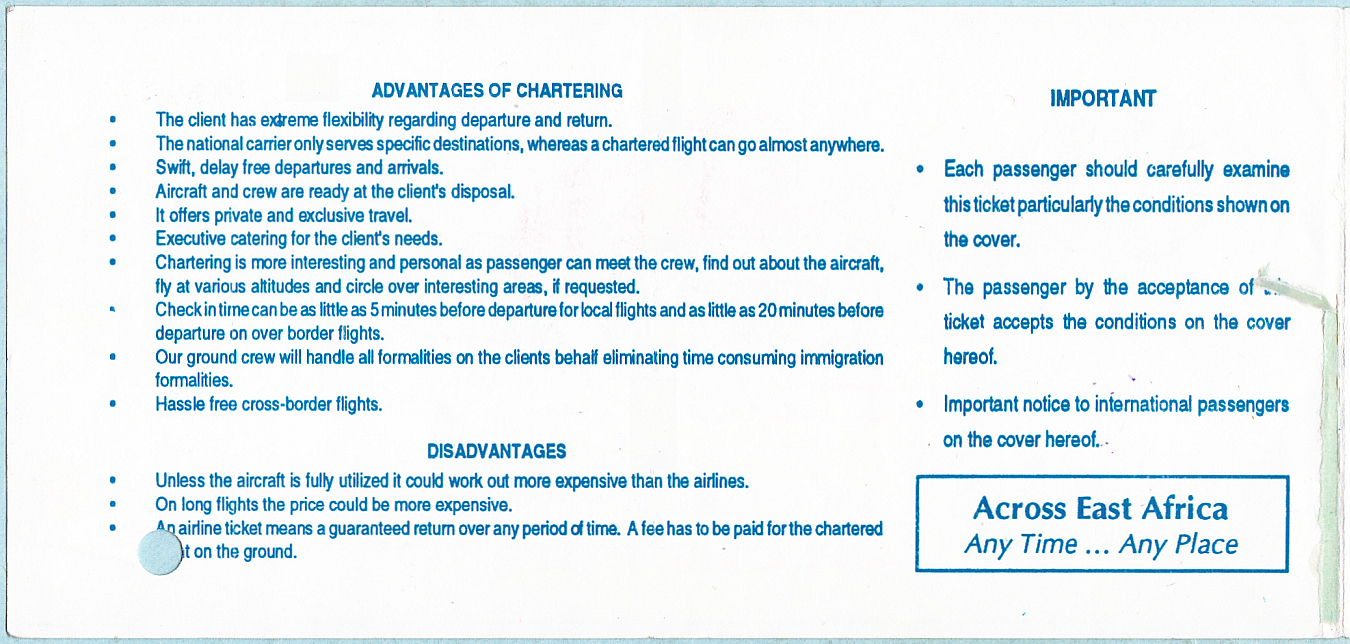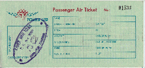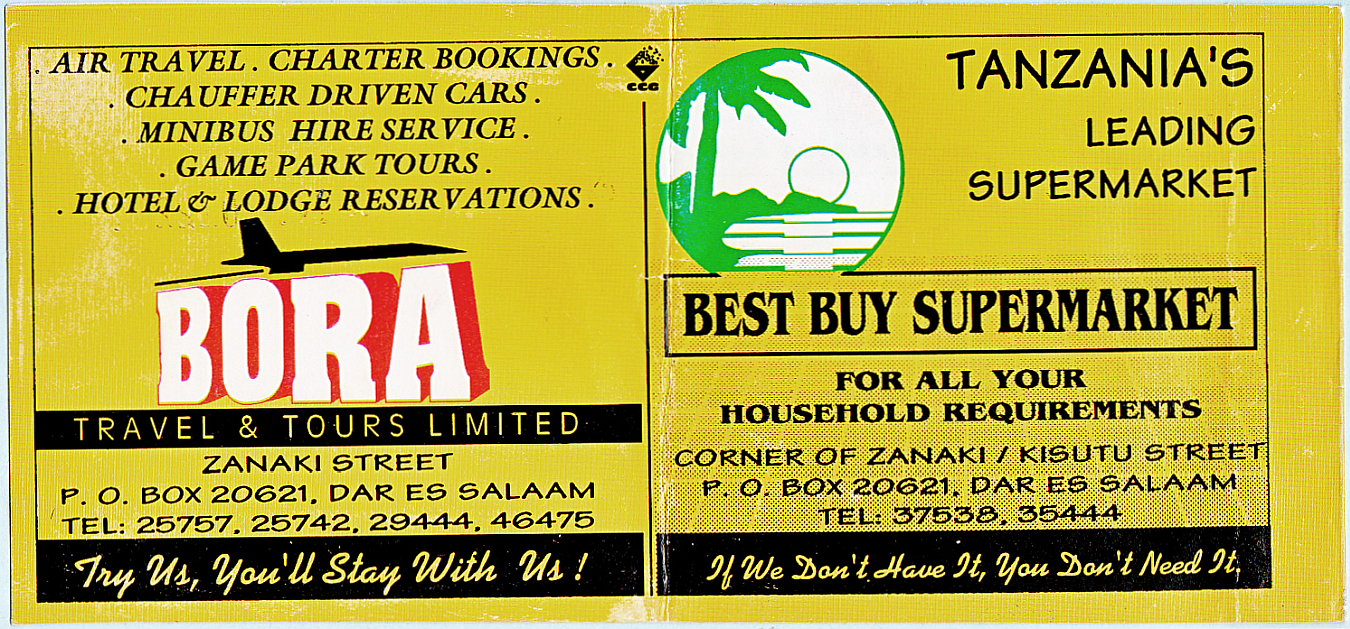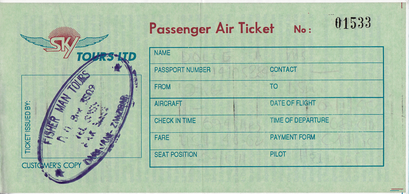Die auf dem Ticket verklebte Steuermarke zu 1000 Tansanischen Schillingen (damals im Gegenwert von etwas mehr 1 US$) deckte dabei die staatlichen Ausreise-Abfertigungsgebühren 'für die Ausreise über einen Flughafen' ("Airport Departure Service Charge") ab. Scheinbar wurde hier, im Gegensatz zu den Fährtickets, zusätzlich keine eigene Ticketsteuer fällig (vgl. [#308][#309]). Interessanterweise zahlten wir in diesem Fall ja auch in Tansanischen Schilling und nicht wie sonst - für Ausländer üblich - den teureren Tarif in US$. Möglicherweise weil damals diese Route vielleicht irgendwie 'unter dem Radar' für Touristen lief, der Zeitungsflieger- bzw. Postflieger auf dem Rückflug zum Festland, eine kleine, einmotorige Cessna (ich meine es war eine 206 oder so?), mit insgesamt 3 Passagieren - meine Frau "durfte" auf den Platz des 'Copiloten', der Rest von uns kauerte irgendwie zwischen der Ladung ... ;-)