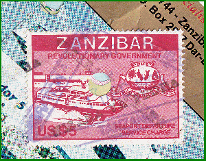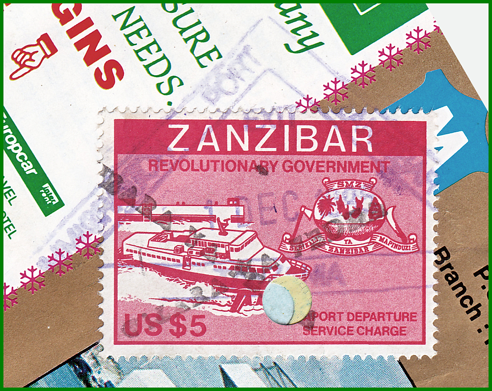 Die auf dem Ticket verklebte Steuermarke aus Sansibar deckt die staatlichen Ausreise-Abfertigungsgebühren ab. Hier mit der bereits bekannte Marke 'für die Ausreise über einen Hafen' - Seaport Departure Service Charce - für Ausländer zu US $5, ...