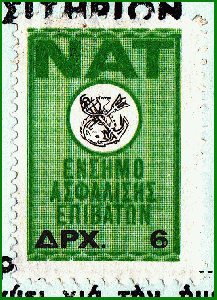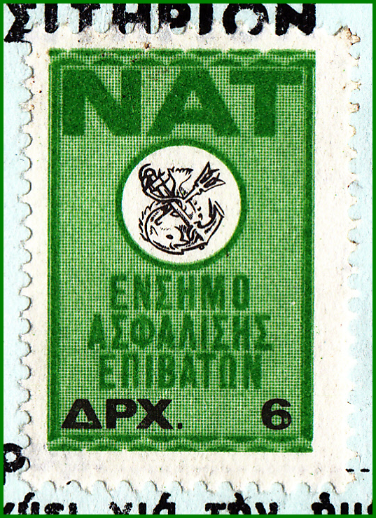 Abgabenmarke zu ΔΡΧ. 6, d.h. 6 Drachmen (keine 10 Pfennig), der ΝΑΤ (Ναυτικό Απομαχικό Ταμείο), in etwa 'Versicherungsfonds für Seefahrer' - das ist der älteste gesetzliche, griechische Sozialversicherungsträger, gegründet im Jahr 1861 - vergleichbar mit unserer Knappschaft für Bergleute. Die Inschrift ΕΝΣΗΜΟ ΑΣΦΑΛΙΣΗΣ ΕΠΙΒΑΤΩΝ bedeutet sinngemäß soviel wie Versicherungsmarke für Fährgäste, was aber nicht bedeutet, dass die Passagiere dadurch versichert sind, sondern die Passagiere versichern hier ihre Fährleute ;-)