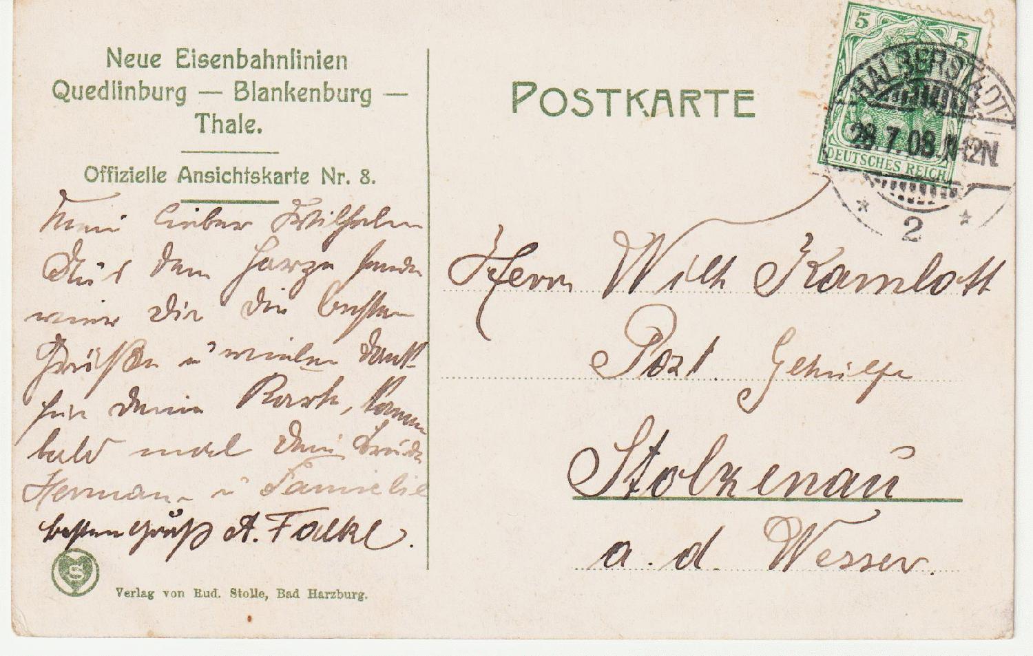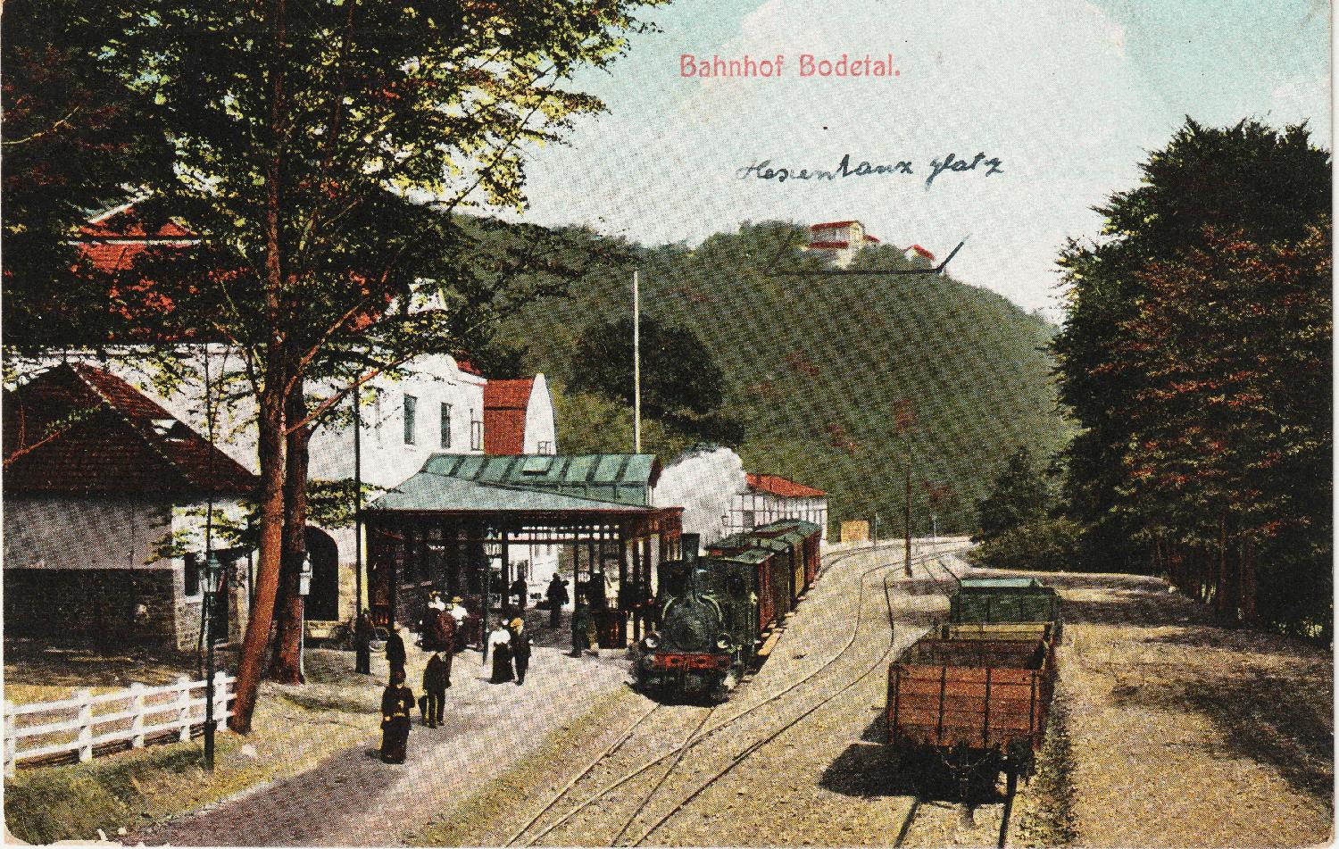 Der Bahnhof Bodetal der Stadt Thale im Eröffnungsjahr 1907. Er lag an der Strecke Blankenburg–Quedlinburg. Zwischen Timmenrode und Warnstedt war der Abzweig nach Bodental . Oben am Berg liegt (handschriftlich vermerkt) der Hexentanzplatz. Die Karte ging im Juli 1908 nach Stolzenau a.d. Weser (geschrieben Wesser).