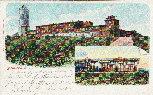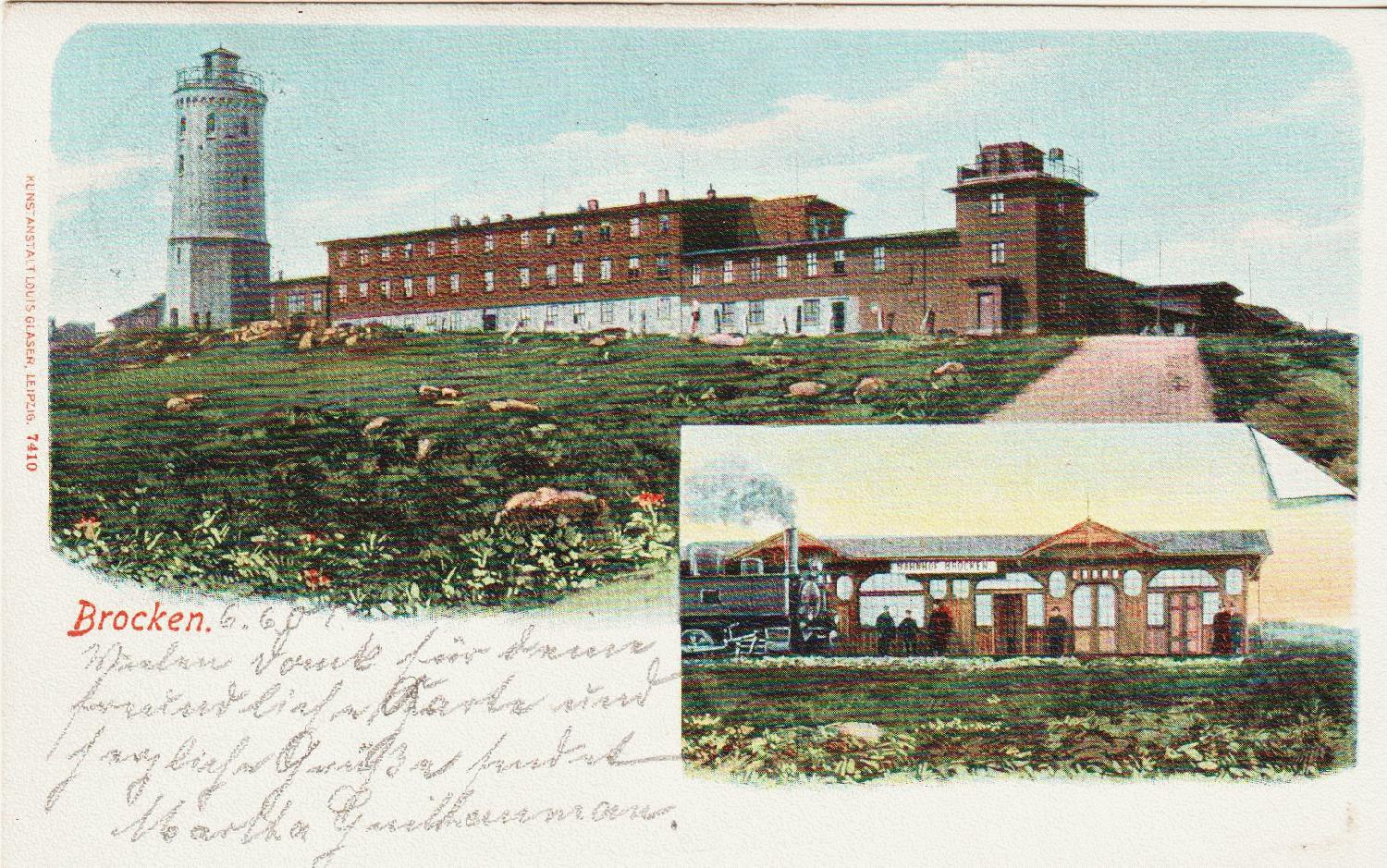 Das Brockenhotel mit Aussichtsturm und Bahnhof der Brockenbahn. Abgesandt 1907 mit Stempel "Brocken"