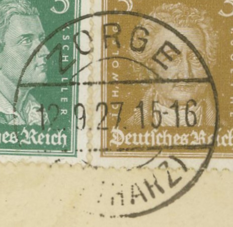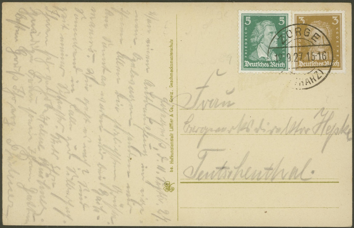 Heute eine Postkarte, die am 12..9.1927 von Zorge nach Teutschenthal gelaufen ist. Die Kartenrückseite zeigt eine idyllische Ansicht des Höhenluftkurortes Hohegeiss.