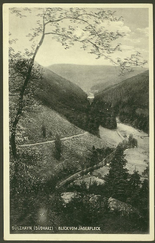 Dazu eine ungebrauchte Ansichtskarte, die ein Tal bei Sülzhayn zeigt.
