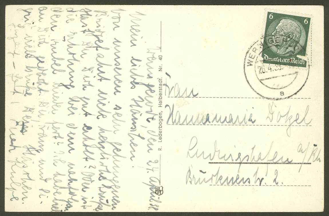 Von mir eine Ansichtskarte, die am 26.4.1938 von Wernigerode nach Ludwigshafen am Rhein befördert worden ist.