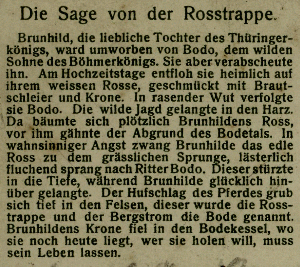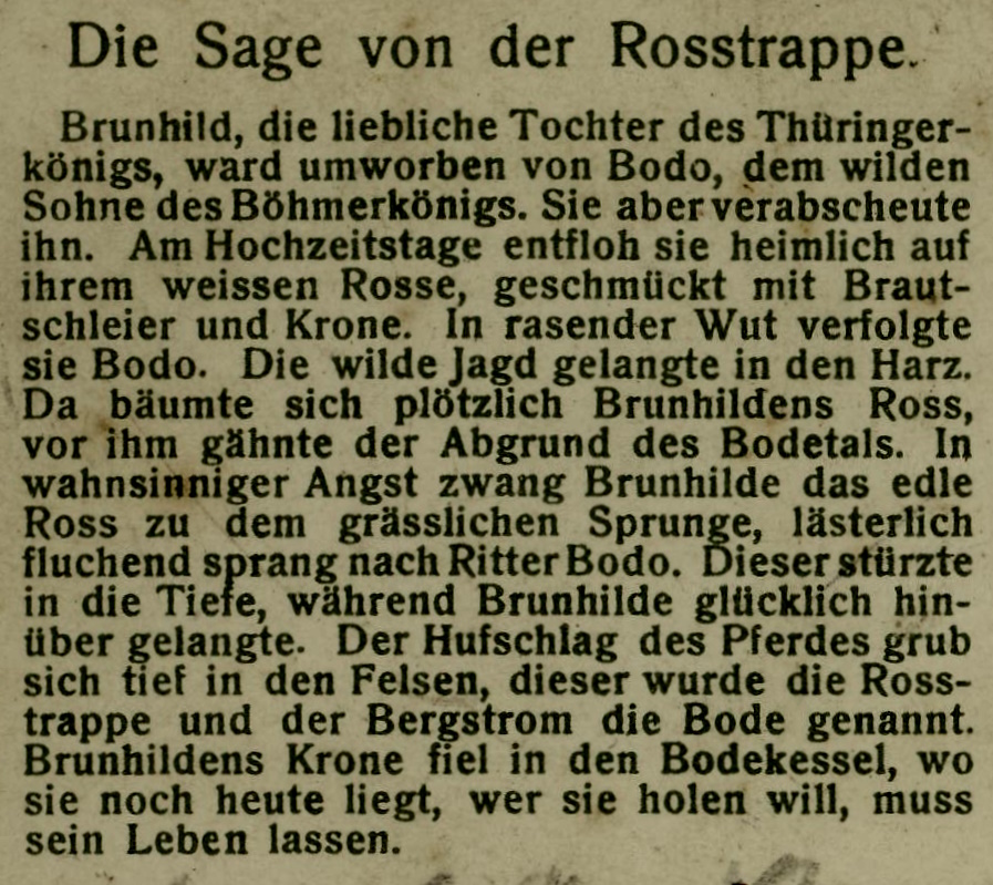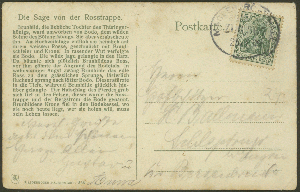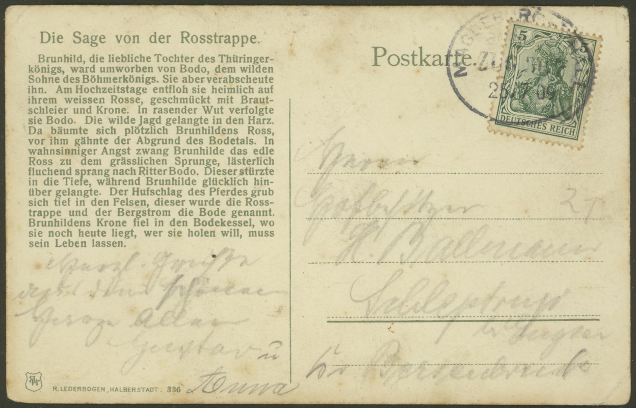 Heute wieder einmal eine Postkarte von der Rosstrappe. Auf der Adressseite ist die Sage von der Rosstrappe aufgedruckt, zur besseren Lesbarkeit habe ich sie aber herausformatiert.