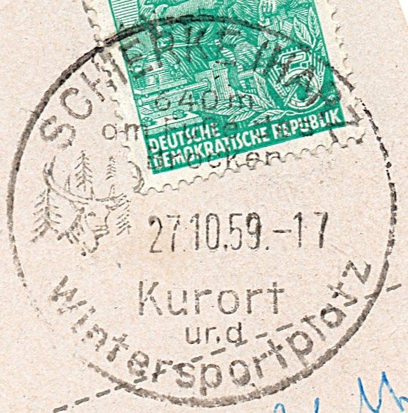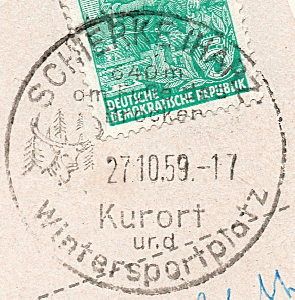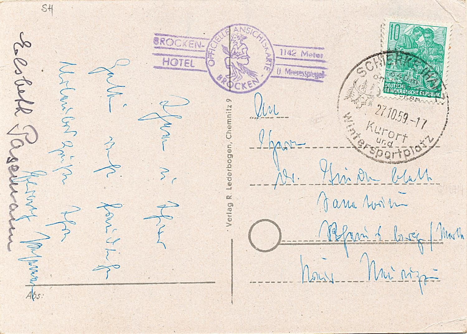 Ansichtskarte von Schierke mit Gelegenheitsstempel und Stempel vom Brockenhotel vom 27.10.1959.