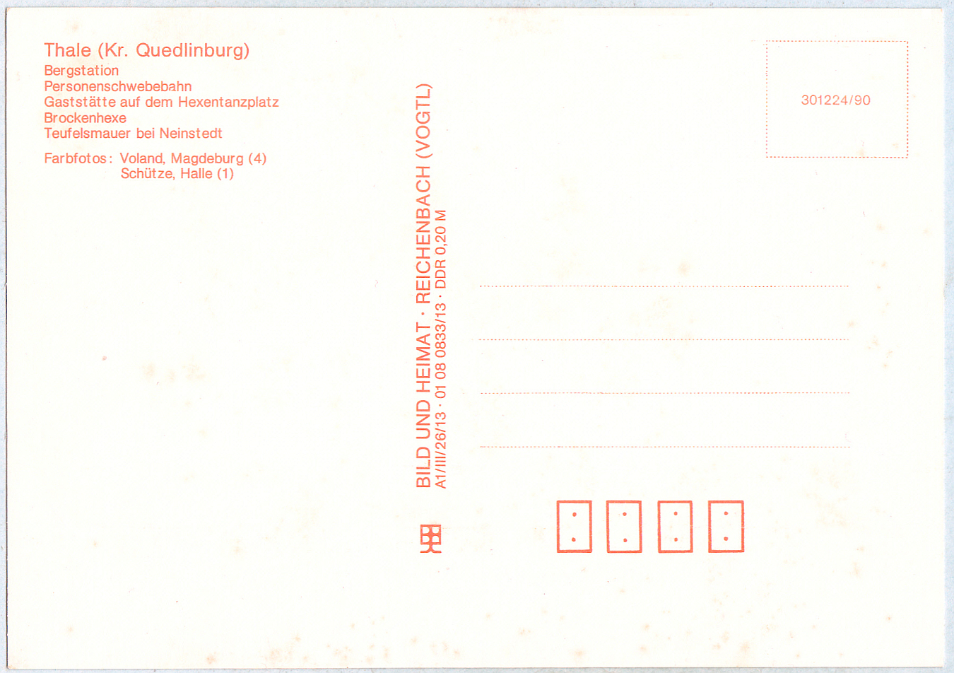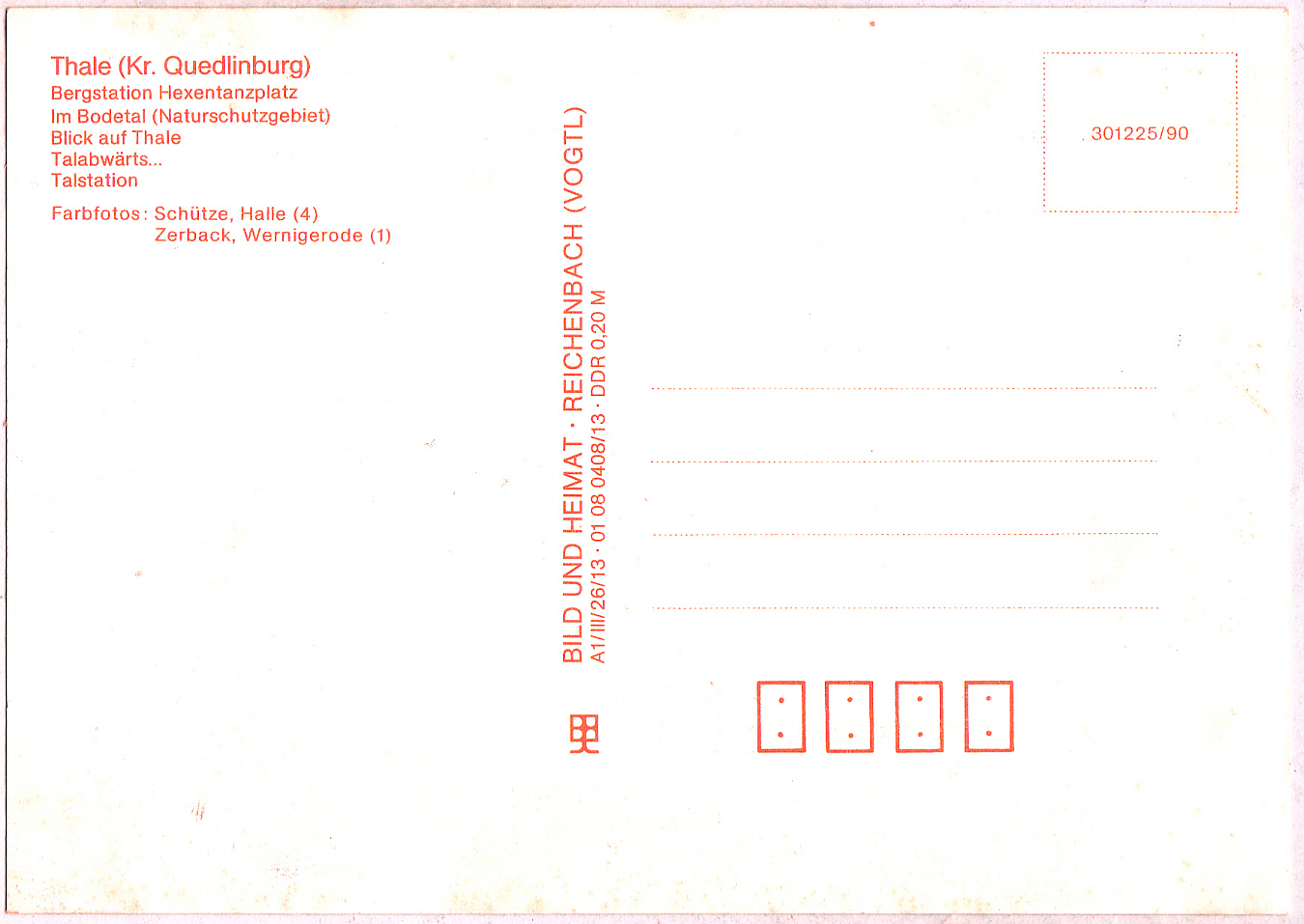 Und kaum hat man etwas ausgegraben, tauchen in der nächsten Kiste gleich noch mehr Ansichtskarten aus Thale aus alten DDR-Zeiten auf, wieder vom Verlag "Bild und Heimat, Reichenbach (Vogtland)", beide nun aber mit der Editionsnummer 301225/90: