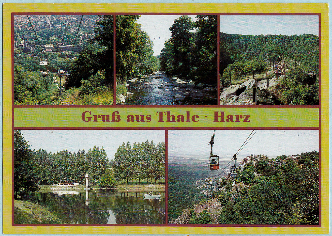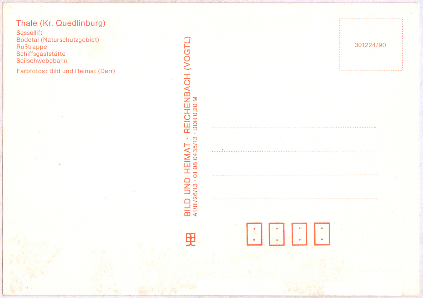 Ansichtskarte Thale (Kr. Quedlinburg): Personenschwebebahn Thale • Harz mit den Bildern "Bergstation Hexentanzplatz", "Im Bodetal (Naturschutzgebiet)", "Blick auf Thale", "Talabwärts..." und "Talstation", Edition "Bild und Heimat, Reichenbach (Vogtland)" mit der internen Nummer 301225/90. Offizieller Druckvermerk bzw. Druckfreigabekennzeichnung A1/III/26/13 • 01 08 0408/13. Der seinerzeitiger Verkaufspreis betrug DDR 0,20 M. Leider unverwendet bzw. ungelaufen... Schade.