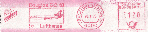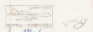 Abgebildet ist das Flugzeug "Douglas DC 10". Dieser Stempel ist zwar schon in der Datenbank, mein Stempel hat aber zusätzlich links den Versandvermerk (offiziell heißt es Wahldruckeinrichtung) "Warensendung".