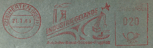 Oben rechts ist eine Propellermaschine zu sehen, Herten wirbt für sich mit einem Flugplatz, der 1912 eingeweiht wurde. Ab etwa 1951 wurde der Flugbetrieb wieder aufgenommen. Eine Hochspannungsleitung für das Steag-Kraftwerk beendete den Flugbetrieb im Jahr 1964, das Gelände diente noch bis 1994 den Modellfliegern. Danach war Schluß in Herten