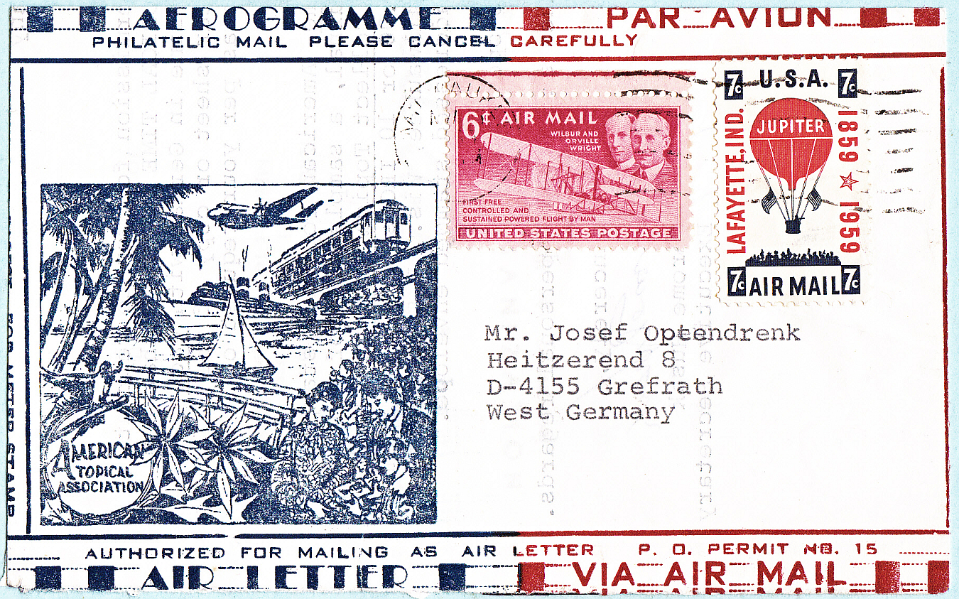 Air Letter bzw. Aerogramm, Schmuckumschlag der "American Topical Association (ATA)" [1], das ist die amerikanische Vereinigung für die thematischen Philatelie, d.h. im weitesten Sinne mit der Motivphilatelie, nach Deutschland. Freigemacht mit den Luftpostmarken 6 Cent (Gebrüder Wright; Scott #C45 von 1949) und 7 Cent (Heißluftballon Jupiter; Scott #C59 von 1959), d.h. mit insgesamt 13 Cent, entwertet mit einem Maschinenstempel in Milwaukee, WI im November 1969.