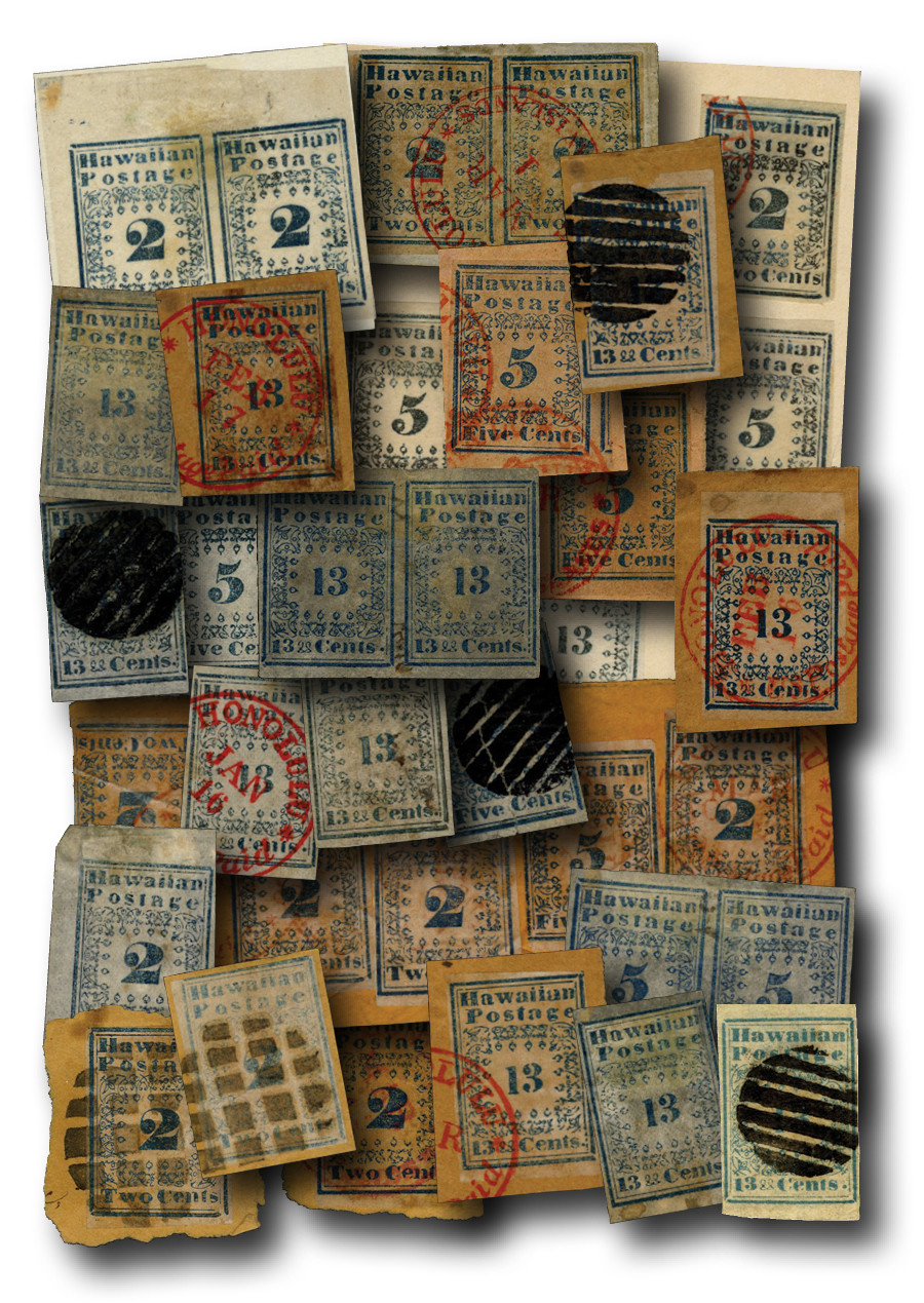 Der Auktionskatalog Siegel vom 7-8. November 1995: Honololu Advertiser Collection (Sammlung Thurston Twigg-Smith) (Advertiser mit t) steht bei mir im Wohnzimmer. Darin wurden 61 Hawaii 5 Cents-Marken aufgelistet. Im Census Siegel (Stand 2020) ist es nur eine Nummer mehr, also 62. Sie verteilen sich wie folgt: