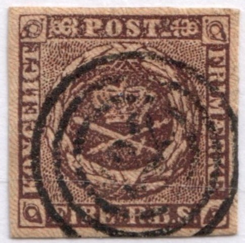 Dänische Briefmarken sind ja in der Regel nicht so schwer zu bestimmen. Habe ich hier eine Nr. 1 ? (Scan 600 dpi) Für mich spricht nichts dagegen, Faserpapier und gute Ränder hat sich auch.
