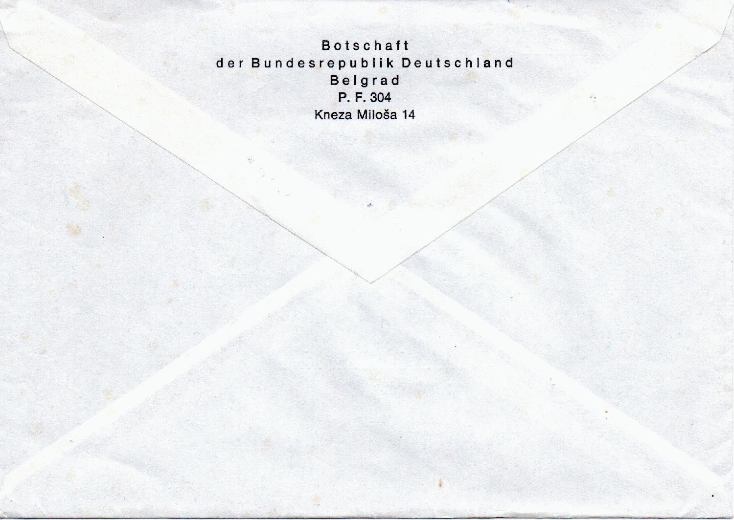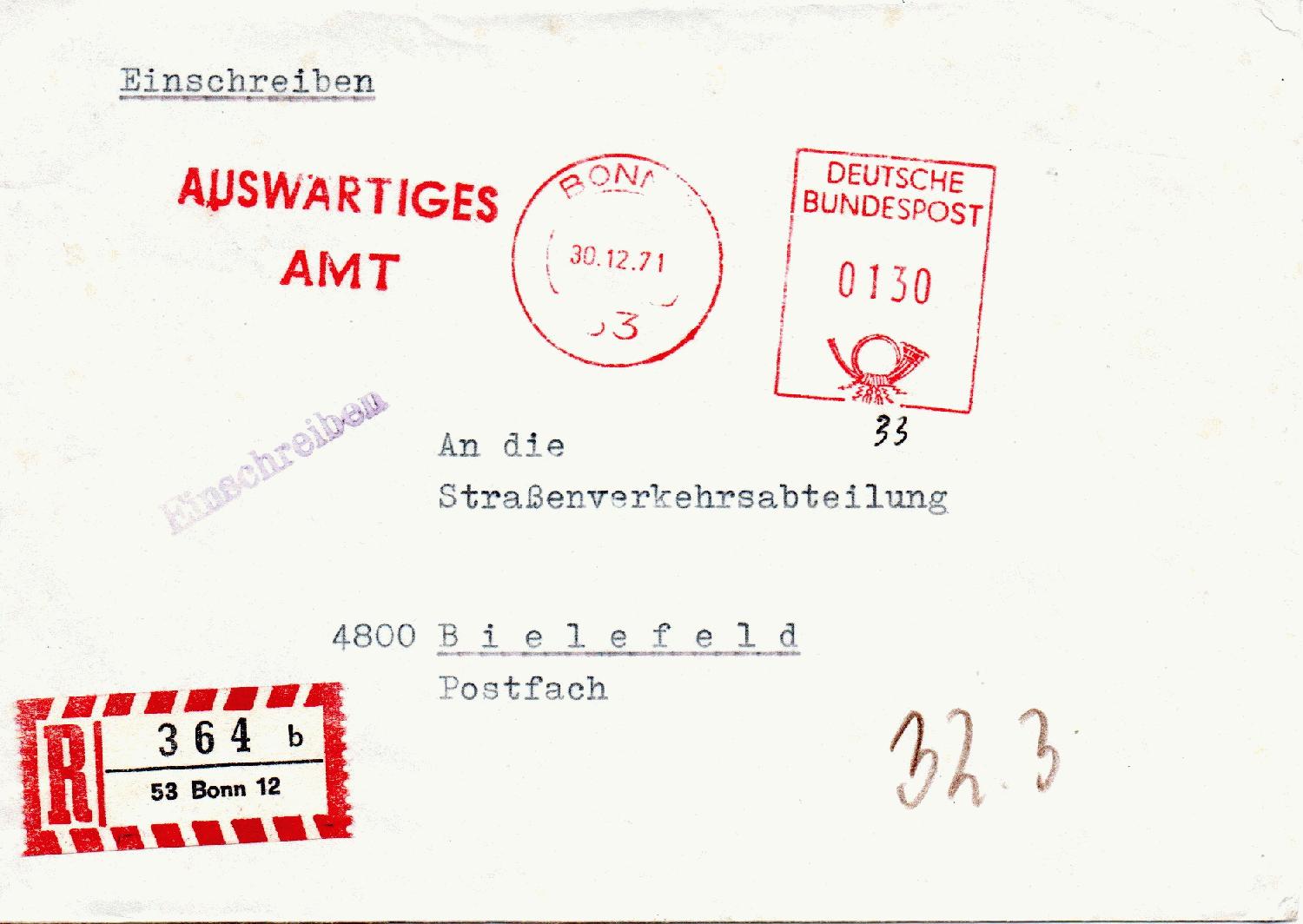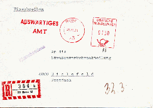 R-Brief vom 30.12.1971 von der Botschaft der Bundesrepublik Deutschland in Belgrad nach Bielefeld, freigemacht mit einem Absenderfreistempel des Auswärtigen Amtes in Bonn über 130 Pfennige.
