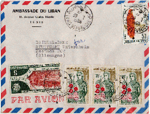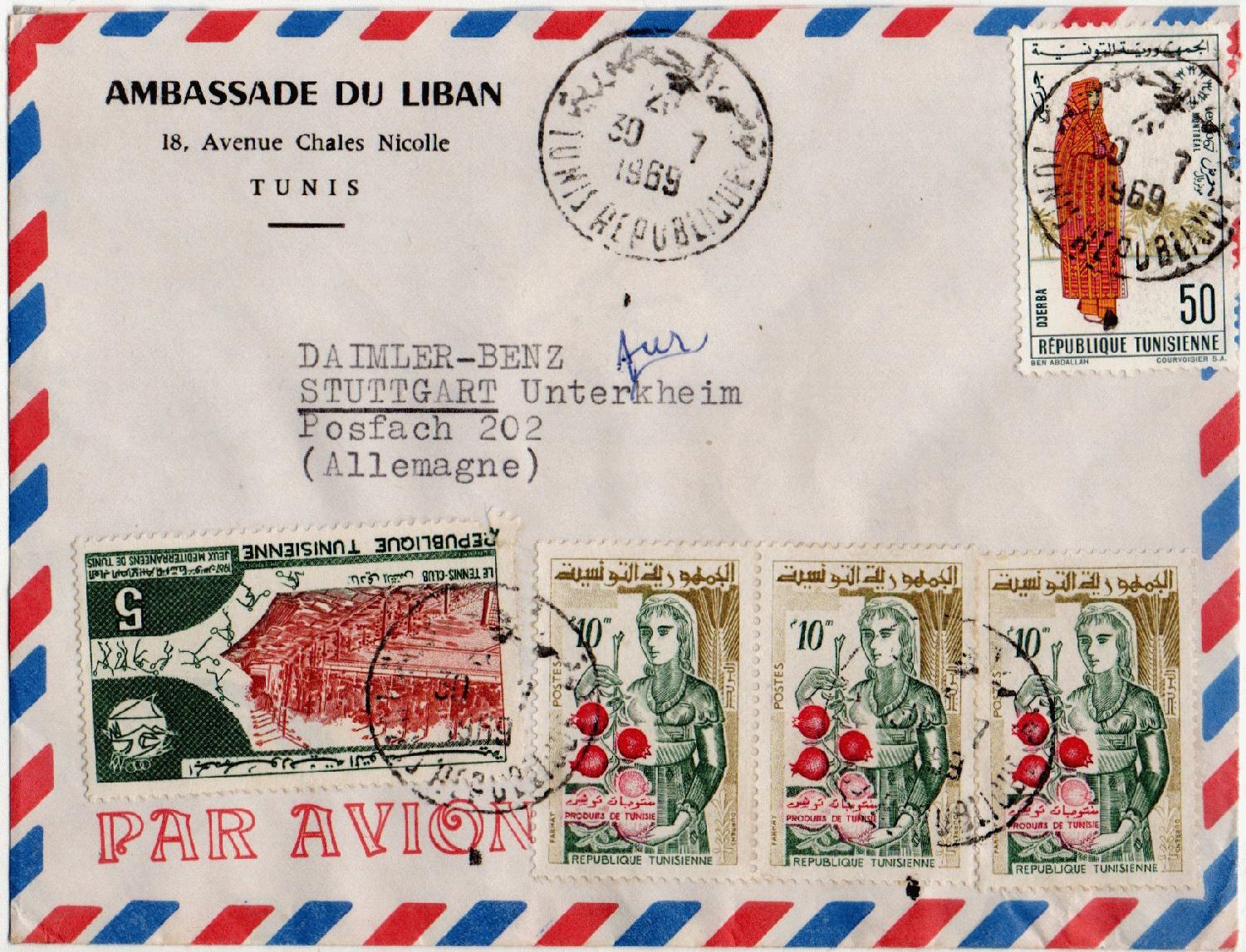 2. Brief der libanesischen Botschaft vom 30.7.1969 mit Stempel TUNIS REPUBLIQUE, ebenfalls freigemacht mit 85 Milliemes.