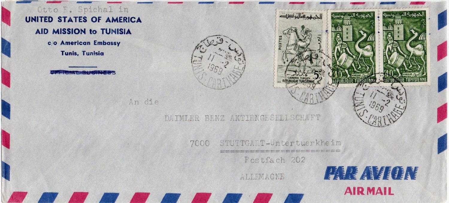 1. Brief der amerikanischen US-Botschaft vom 11.2.1969 mit Stempel TUNIS CARTHAGE, freigemacht mit 85 Milliemes.