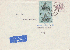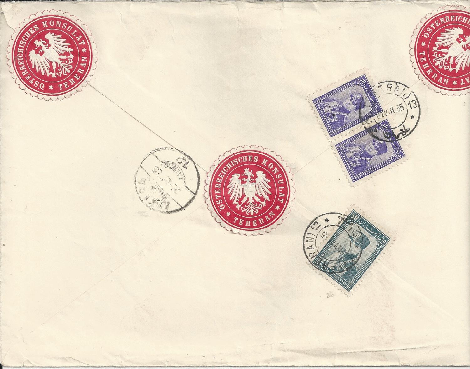 der Zustand des Briefes ist verblüffend gut. Nach der Frankatur 5,10 Rial muss er zwischen 81 und 100 Gramm gewogen haben. Gebühr 1,50 R + 4 x 0,90 R.