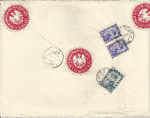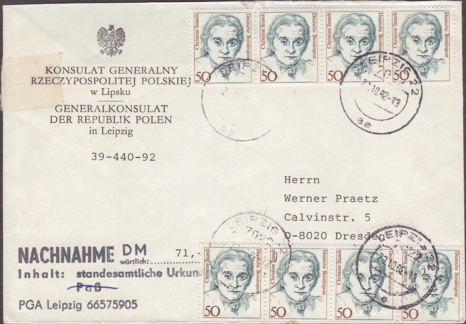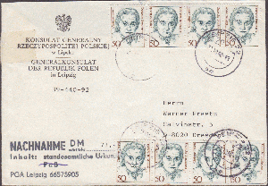das Leipziger Generalkonsulat von Polen sendete per Nachnahme für 71,00 Mark eine standesamtliche Urkunde am 29.10.1992 nach Dresden. Der Brief kostete 1,00 Mark und die Nachnahmegebühr schlug mit 3,00 Mark zu Buche. Die insgesamt vier Mark wurden mit 8 mal der MiNr.1304 dargestellt.