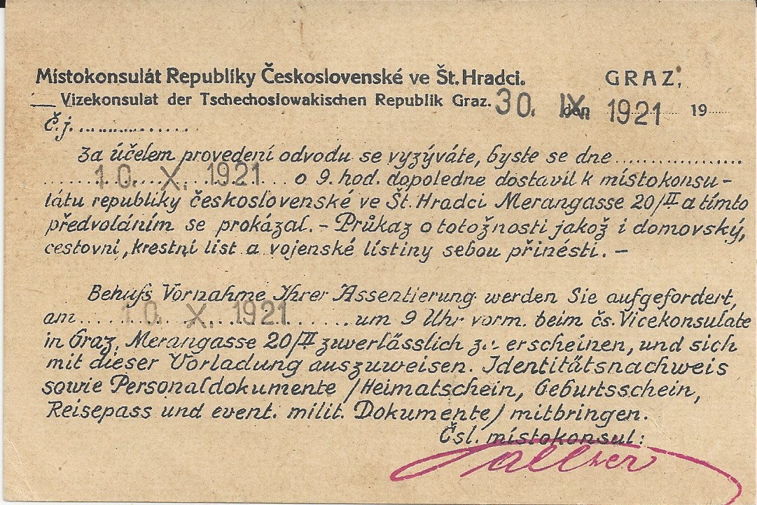Der Empfänger der Karte wurde aufgefordert, am 10.10.21 zwecks Assentierung beim Vicekonsulat zu erscheinen.