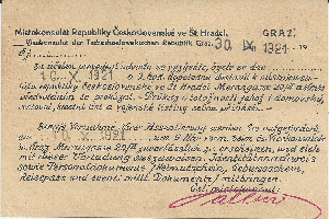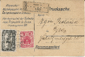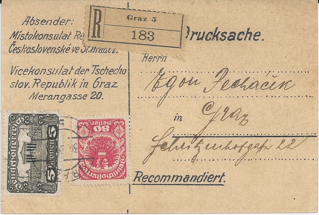 Eingeschriebene Drucksache des Vicekonsulats der Tschechslovakischen Republik in Graz vom 30,9.1921.