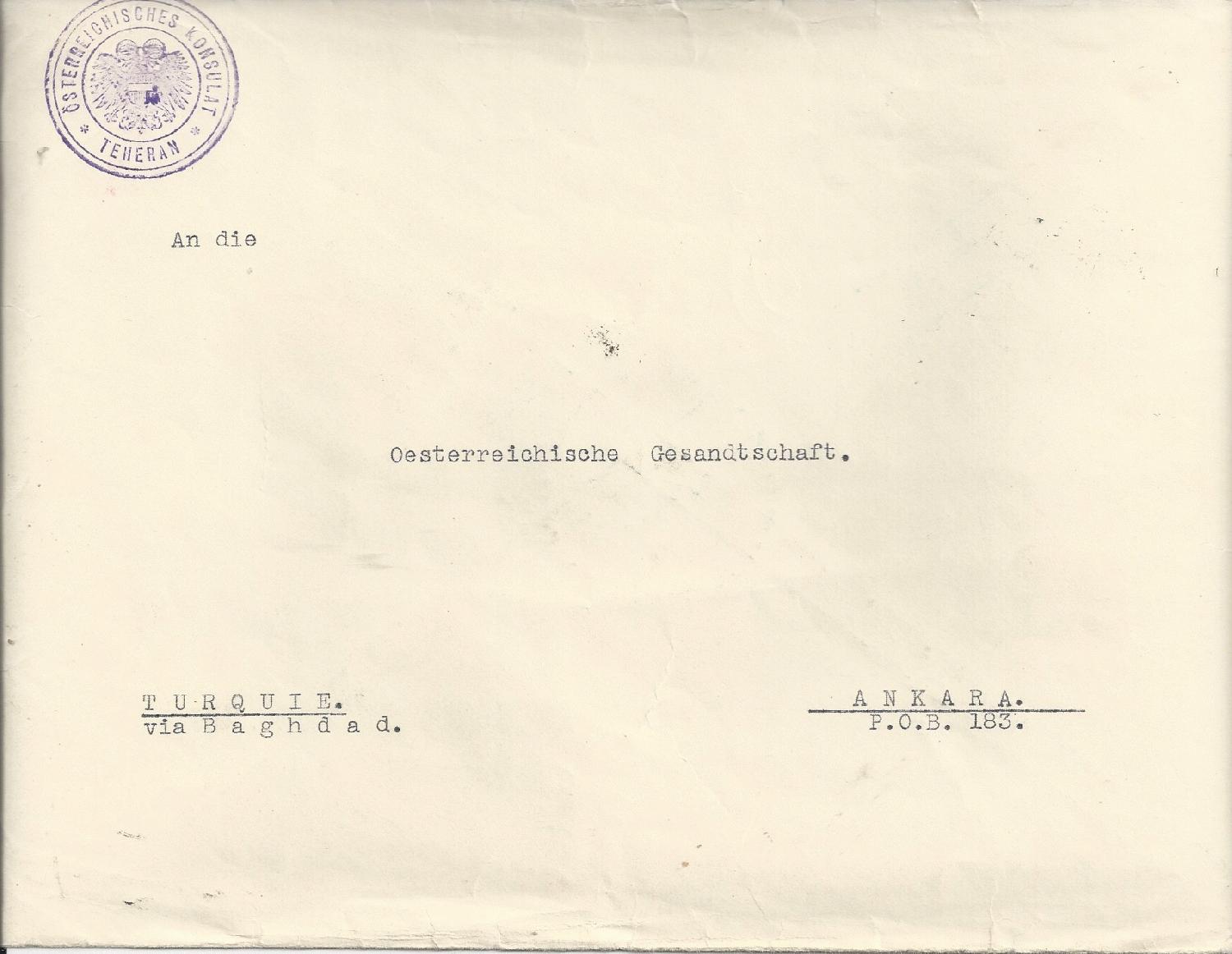 Brief vom 20.8.1935 von Teheran an die österreichische Gesandtschaft in Ankara. Absenderin ist die österreichische Gesandtschaft in Persien.