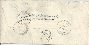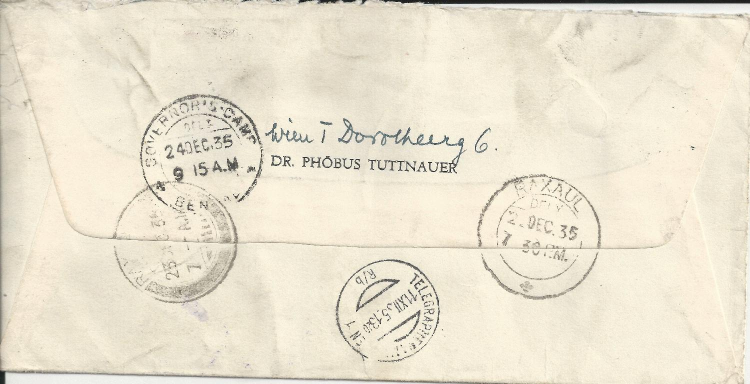 Rückseitig befindet sich der Rohrpoststempel des Telegraphenamts Wien 1 sowie der Stempel von Raxaul 2.12.35. Raxaul liegt an der Grenze zwischen Indien und Nepal. Desweiteren ein Stempel Governors Camp 24.12.35 mit einem Text im Stempel den ich nicht zuordnen kann. Auch den Stempel beginnend mit RA .. 23.12.35 kann ich nicht bestimmen.