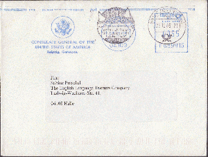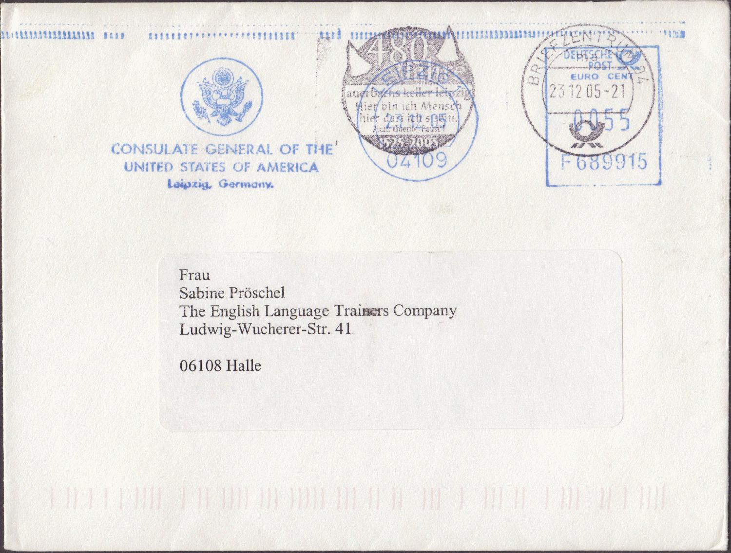 am 23.12.2005 sandte das Generalkonsulat der USA in Leipzig einen Brief nach Halle a.Saale. Das Konsulat verwandte einen Absenderfreistempel. Die Maschine ist von Frankotyp-Postalia. Der Brief fand im Briefzentrum 04 trotzdem den Weg durch die Stempelmaschine.