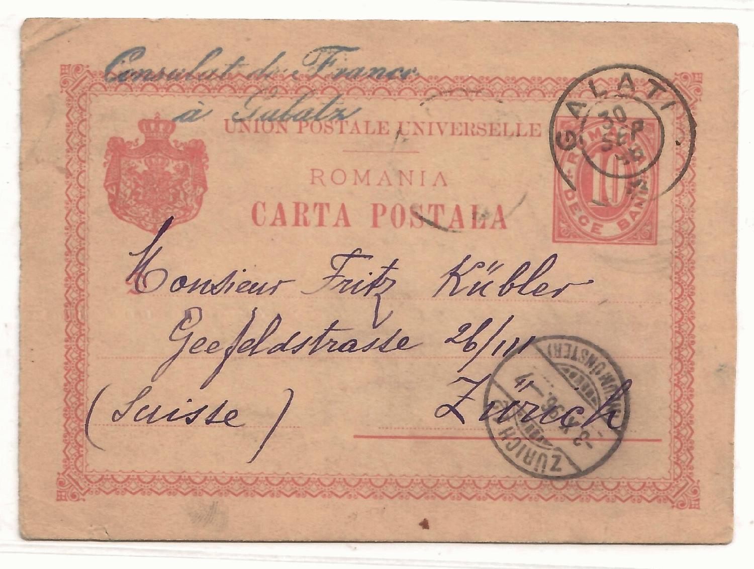 Abgeschlagen am 30. September 1896 in Galati lief diese wunderschöne Ganzsache in feinster französischer Sprache verfasst nach Zürich, wo sie am 3. Oktober eintraf.