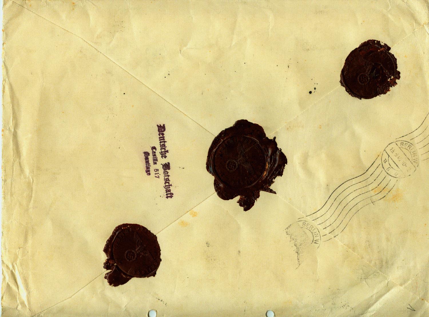 Mit meinem Brief wurde noch ein weiterer Brief von der Botschaft in Santiago ans Auswärtige Amt in Berlin angeboten. Dieser wurde "nur" mit 200,20 Pesos frankiert und am 18.6.1940 gestempelt (Ankunft 29.6.1940). Er ist auch nur als Luftpostbrief aufgegeben worden. Ich habe mich natürlich für den schwereren Brief entschieden.