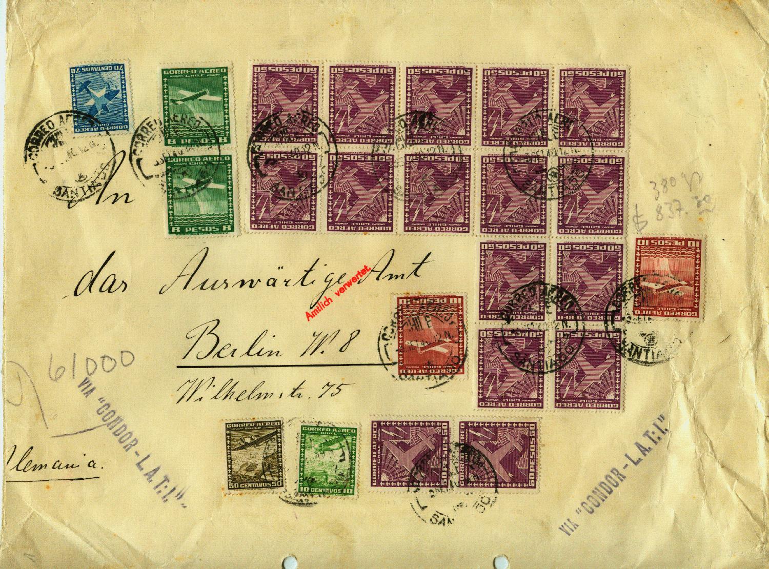 Ich würde den Brief als echten Bedarfsbrief bezeichnen. Der Luftpostbrief (Leinenbrief) mit einem Gewicht von 380 Gramm wurde am 3.9.1940 von der Deutschen Botschaft in Santiago (Chile) an das Auswärtige Amt in Berlin (Ankunftsstempel vom 13.9.1940) geschickt. Rückseitig befinden sich drei Siegel mit der Inschrift "Deutsche Botschaft in Santiago". Zur Frankatur wurden Marken für insgesamt 837,30 Pesos (dabei 18 mal der Höchstwert von 50 Pesos der Luftpostausgabe von 1934) verwendet. Vorne wurde ein Stempel "VIA CONDOR-L.A.T.I." angebracht. L.A.T.I. steht für die italienische Fluglinie Linee Aeree Transcontinentali Italiane.