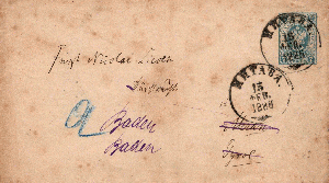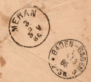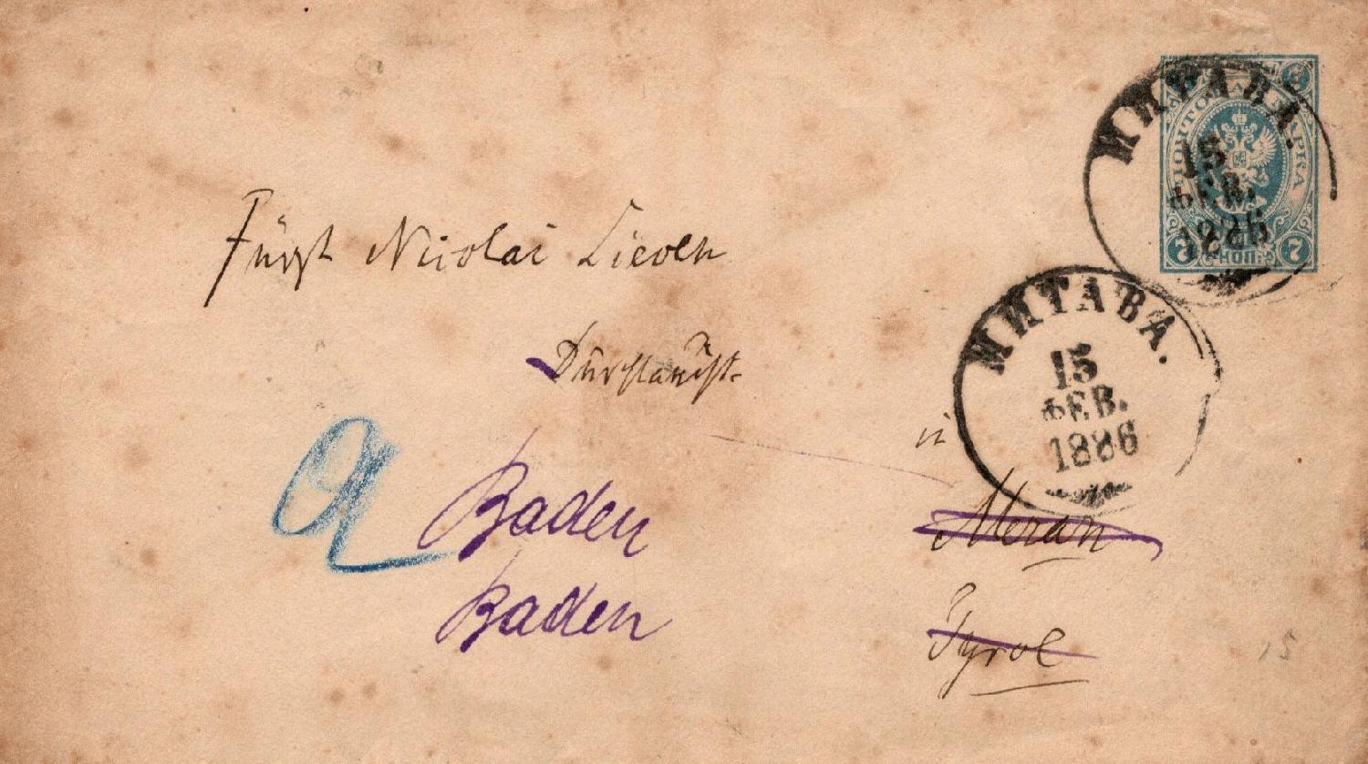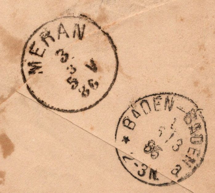 ein Kuvert zu 7 Kopeken wurde in ?? am 15.2.1886 an Fürst Nicolai Lieven, Durchlaucht, in Meran verschickt und kam dort am 3.3. an. Jedoch weilte ihre Gnaden nicht mehr im lieblichen Meran, sondern war in das ebenso liebliche Baden-Baden weitergereist, weswegen man in Meran die Adresse auf "Baden Baden" korrigierte und das Stück nachsandte, wo es am 5.3. ankam.