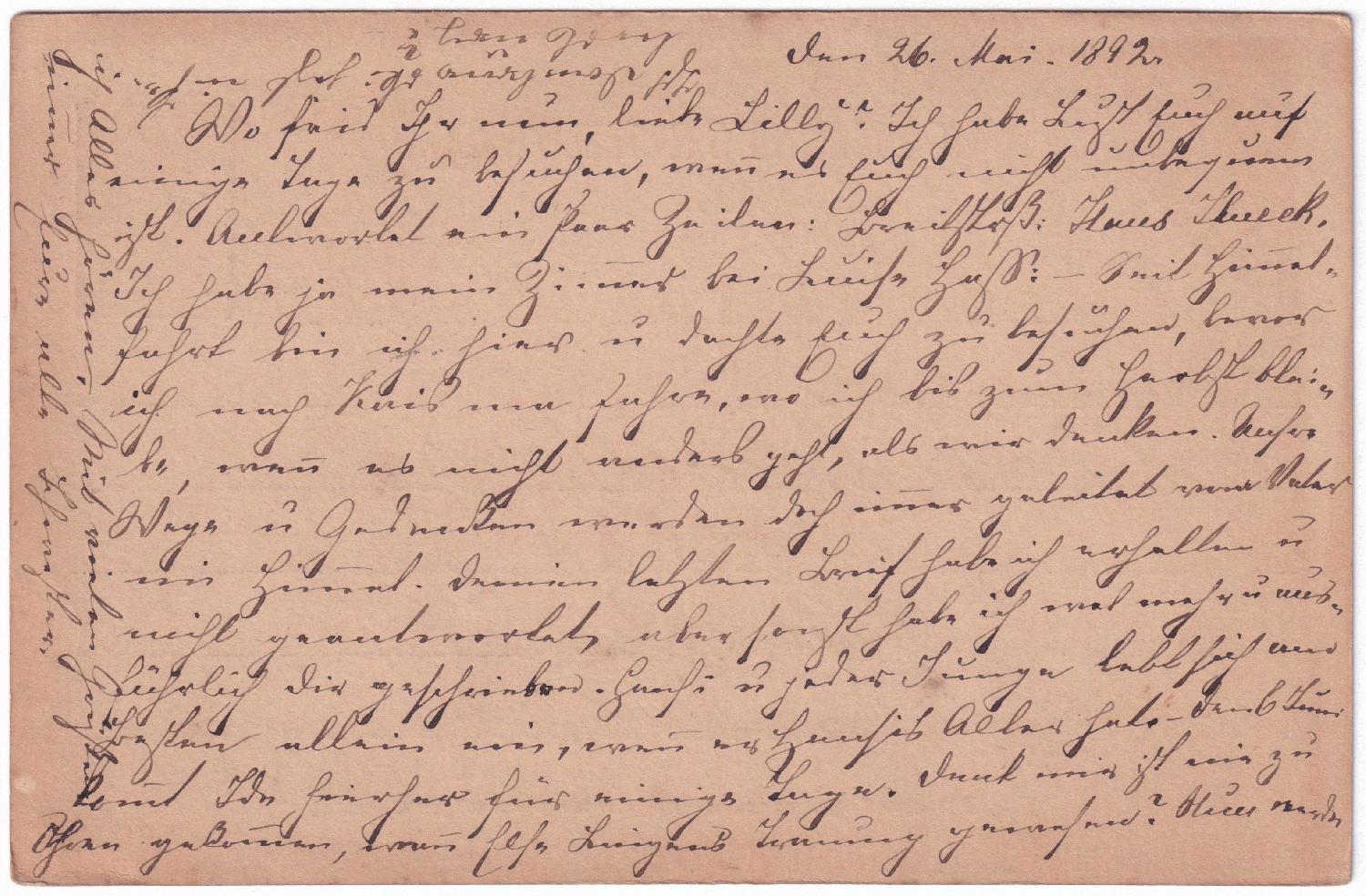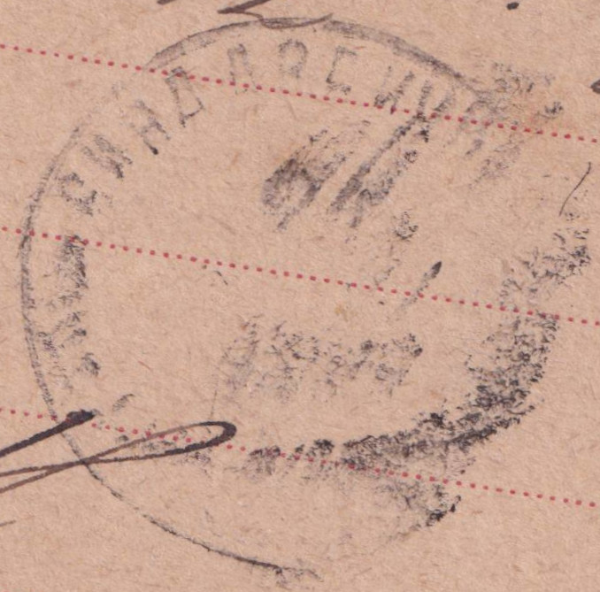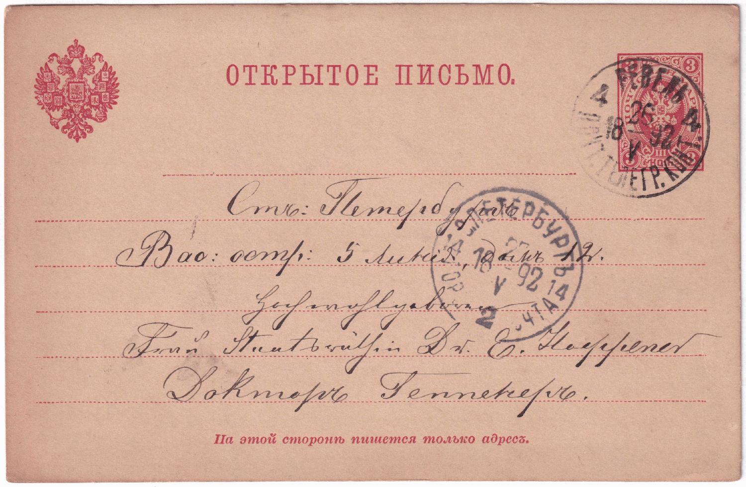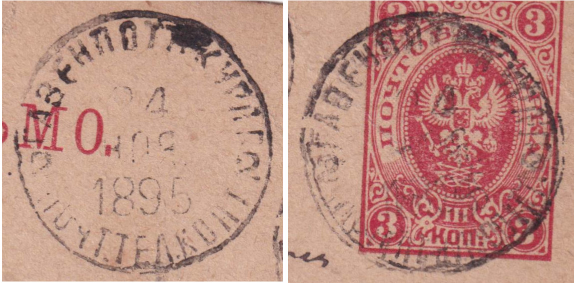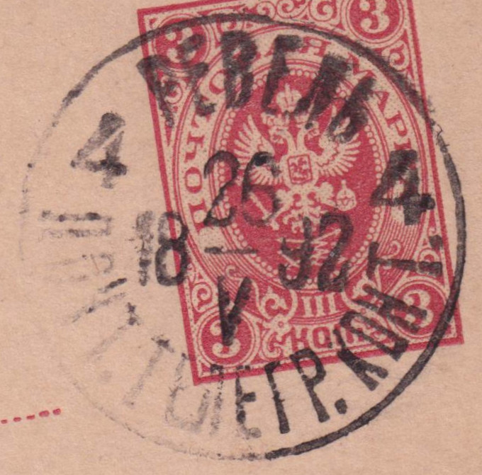 Die Karte wurde am 26.05.1892 in Ревель = Tallinn der Post übergeben. Unten im Stempel steht ПОЧТ. ТЕЛЕГР. КОНТ. = Почта телеграф конто́ра = Post- und Telegrafen-Büro.