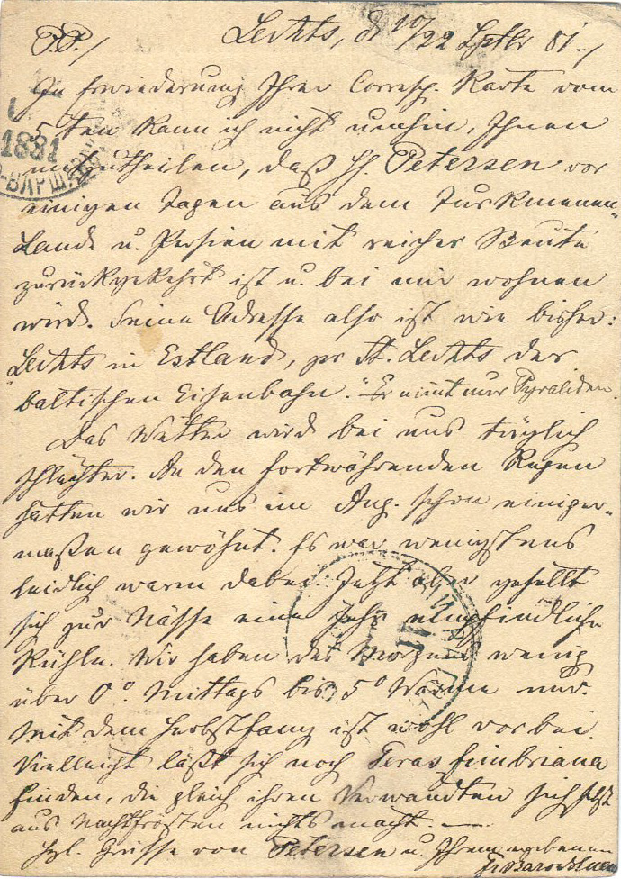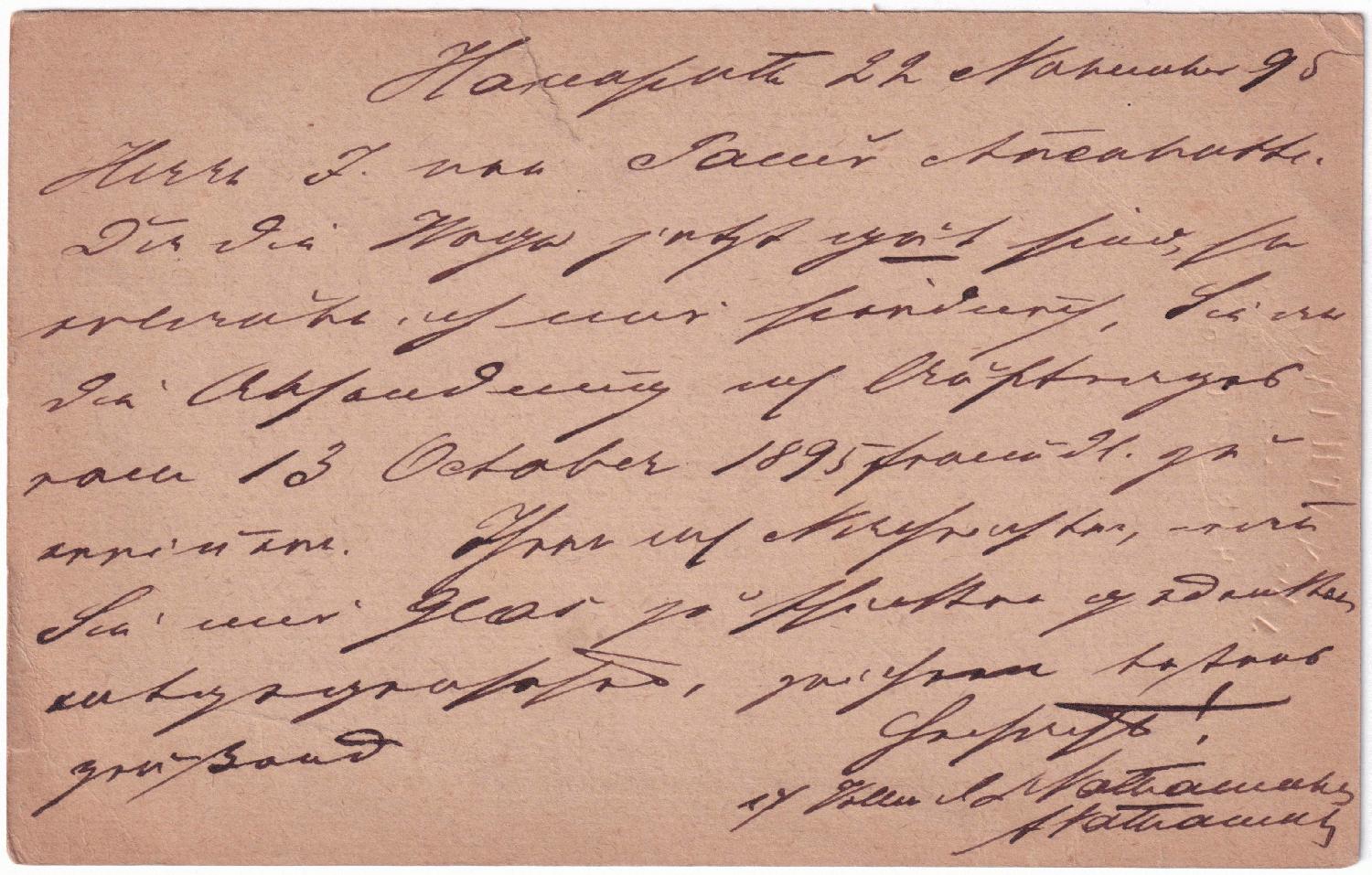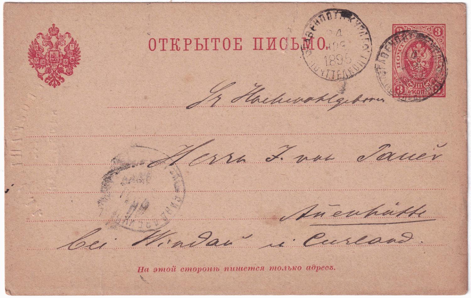 Die Postkarte wurde am 24.11.1895 (jul.) in Hasenpoth im Kurland aufgegeben. Im Stempel habe ich entziffert:
