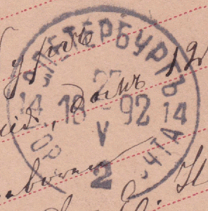 Einen Tag später kam sie am Ziel an. Der Ankunftsstempel ist aus С. Петербург = Санкт-Петербург = St. Petersburg. Es könnte sein, dass unten steht ГОРОД ПОЧТА = Город почта = Stadtpost. Liege ich damit richtig?