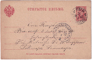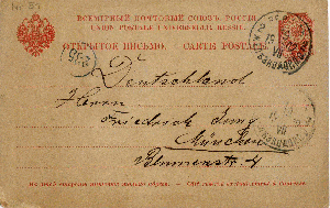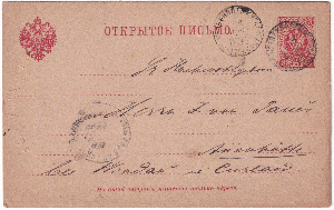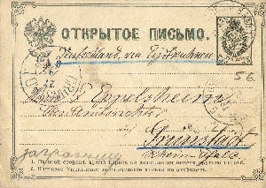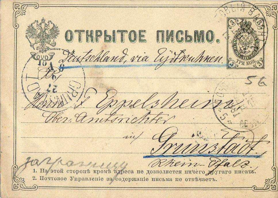 Ganzsachen Postkarte mit Werteindruck von 3 Kopeken vom 22.10.1883 aus Russland, spediert an Herrn Eppelsheim, Kgl. bayr. Oberamtsrichter in Grünstadt, hier kam die Karte am 28.10.1883 zur Ausgabe.