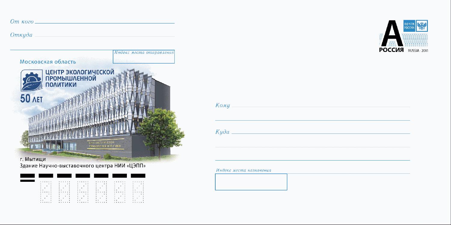 Abgebildet im Cachet ist das Gebäude des Zentrums für "Umwelt-Industrie-Politik", das seit 50 Jahren in der Moskau-Region besteht.