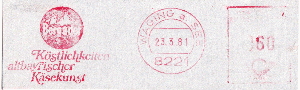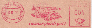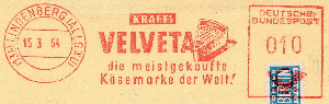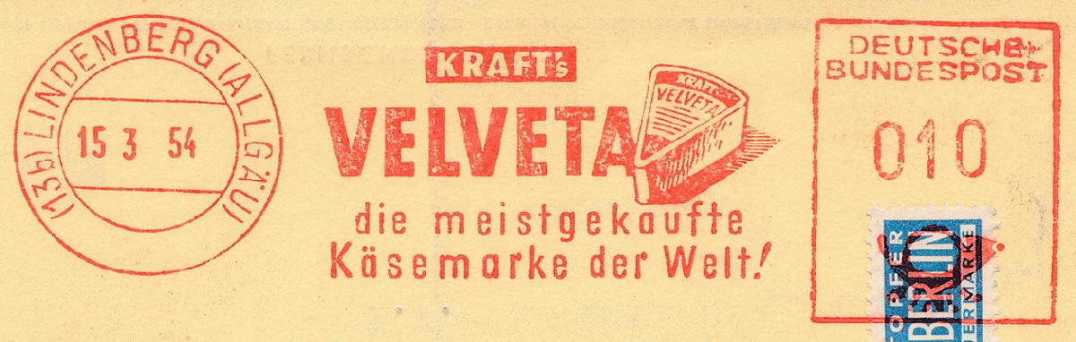 1934 errichtete die US-amerikanische Kraft Cheese Company eine neue Schmelzkäsefabrik in Lindenberg im Allgäu. Der erste Markenartikel war 1937 "Velveta", ein von J.L.Kraft selbst entwickelter Schmelzkäse auf Chester Basis. Velveta wurde während der „Fresswelle11 nach dem Krieg zu einem geschätzten Artikel. Dem Unternehmen erbrachte dies gute Gewinne, der Stadt beachtliche Steuereinnahmen sowie internationale Bekanntheit. "Kraft Scheibletten" wurden ab 1956 ein weiterer großer Erfolg [1]. Der rechte Stempel kommt von Philastempel.
