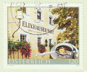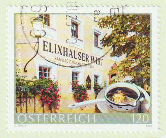 Österreich 2025: Das traditionsreiche Hotel Elixhauser Wirt in Elixhausen bei Salzburg zeigt eine kulinarische Köstlichkeit wie den auf der Briefmarke abgebildeten Tafelspitz. Bei mir zuhause heißt der auch Krenfleisch.